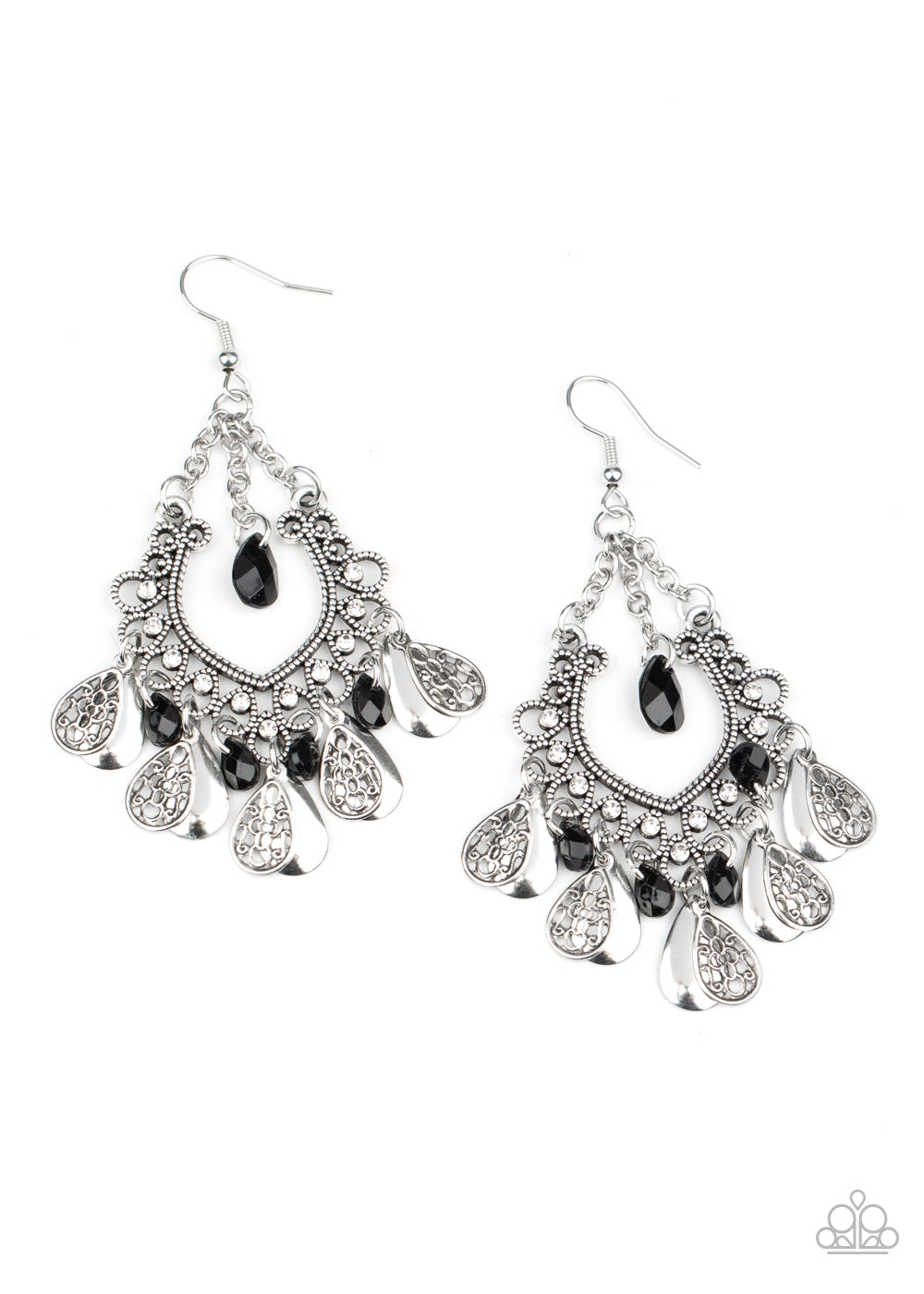 A collection of plain and filigree-filled silver teardrops and black crystal-like teardrops dangle from the bottom of a frilly silver frame dotted in dainty white rhinestones. A solitaire black crystal-like bead is suspended from a single chain at the top for a whimsical finish. Earring attaches to a standard fishhook fitting.