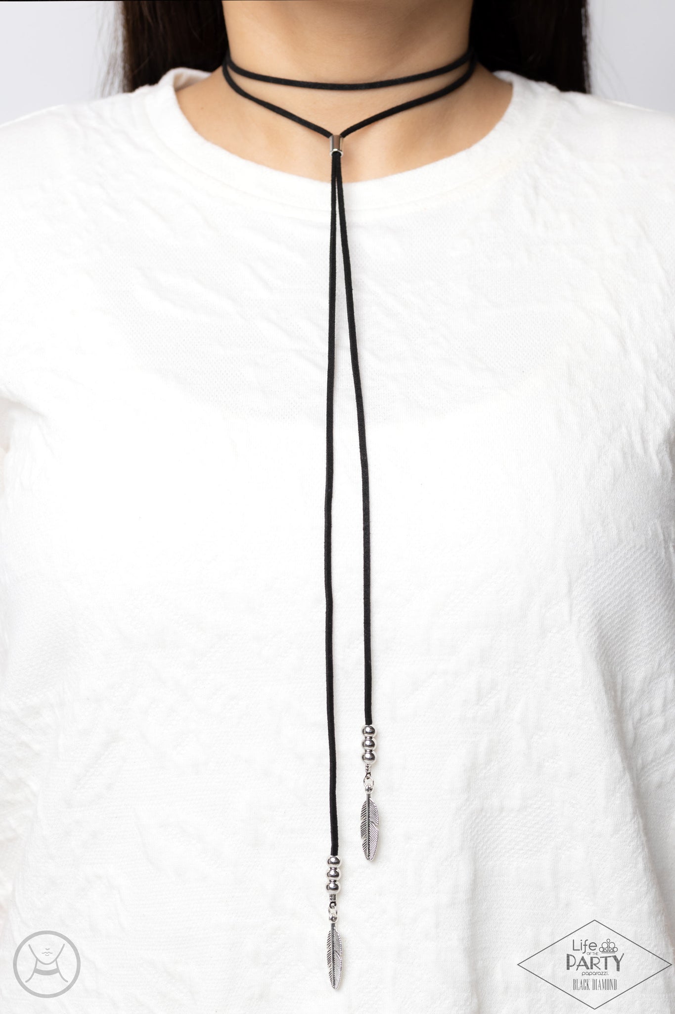 Infused with silver beaded accents, a lengthened strip of black suede double wraps around the neck, creating a layered choker necklace. Two whimsical silver feathers swing from the ends as a silver bead slides up and down the suede strands, adjusting the length of the wanderlust piece.