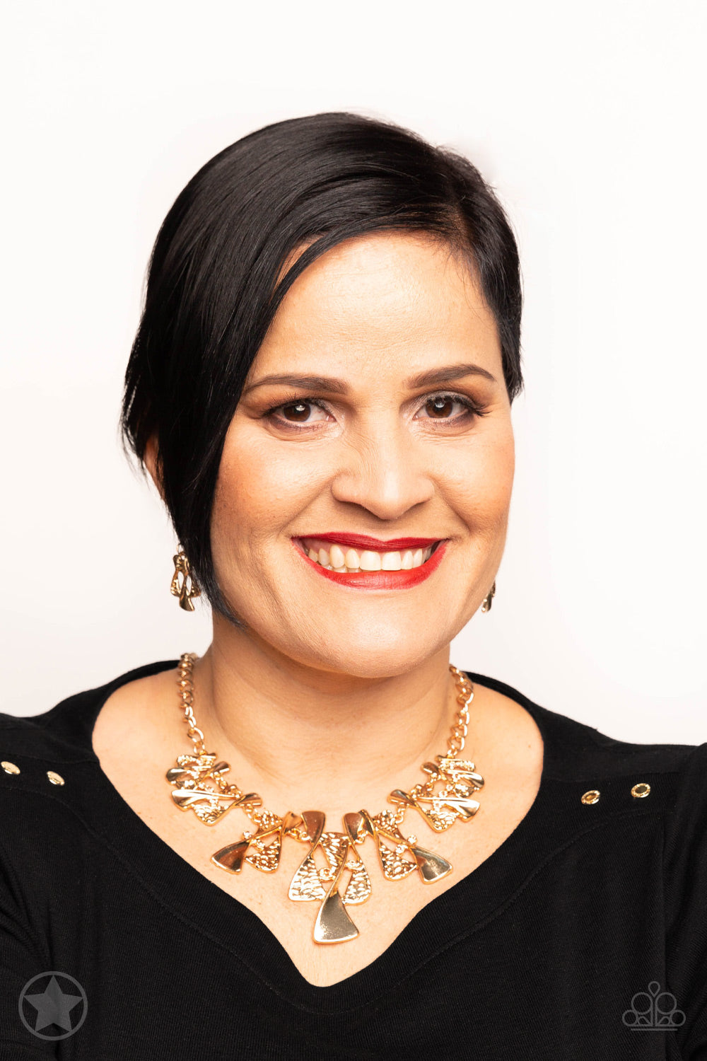 Twisted gold hourglasses dance along a chunky gold chain with tiny peach rhinestones adding sparkling, elegant accents. Beautiful textured pieces add depth to the design. Features an adjustable clasp closure.