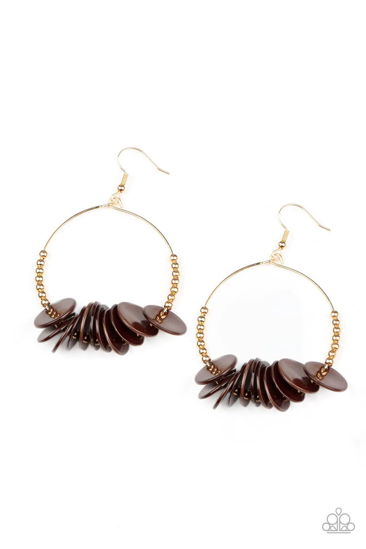 Shiny brown shell-like discs alternate with dainty gold beads around a petite circular gold wire frame for a touch of Caribbean charisma. Earring attaches to a standard fishhook fitting.