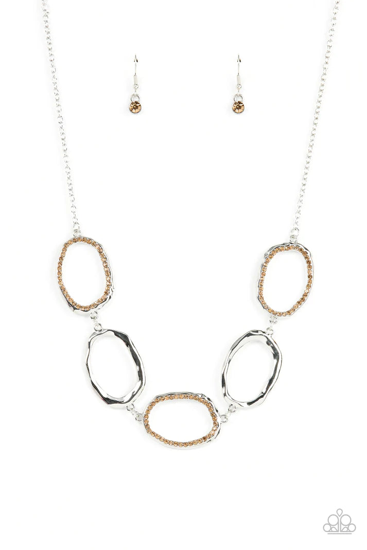 A row of dazzling light topaz rhinestones makes its way around a delicately hammered imperfect circular frame. The airy frames alternately link end to end with similar shiny silver frames creating a glitzy fashion across the collar. Features an adjustable clasp closure.