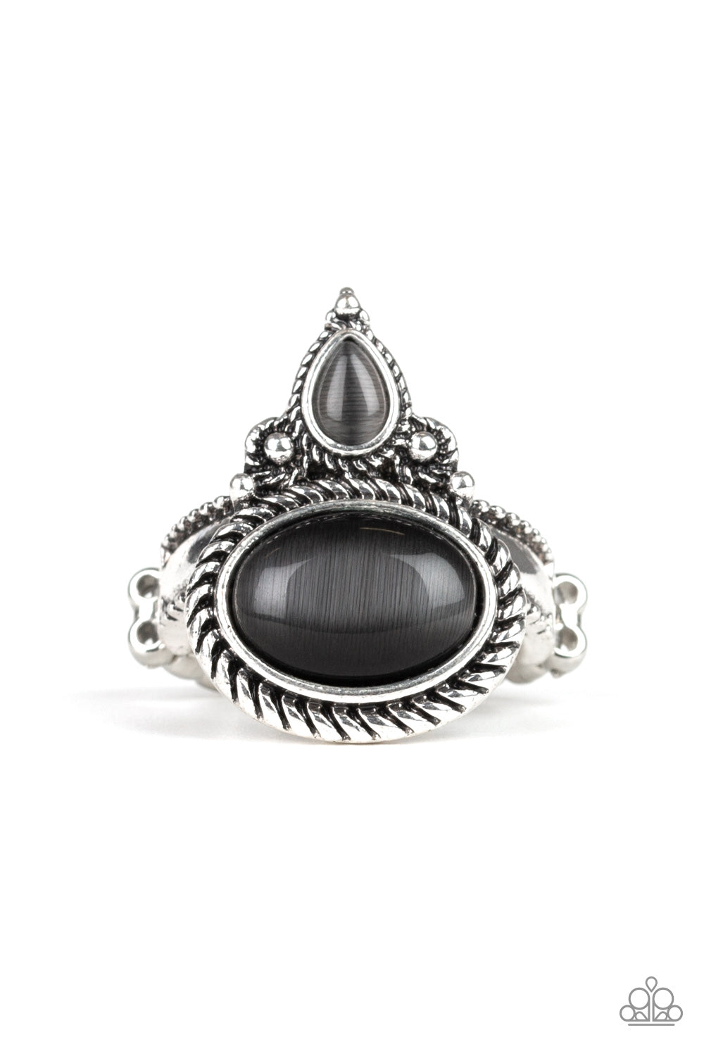 A teardrop and oval cat's eye stone is pressed into an ornate silver frame radiating with studded and metallic rope textures for a whimsical flair. Features a dainty stretchy band for a flexible fit.