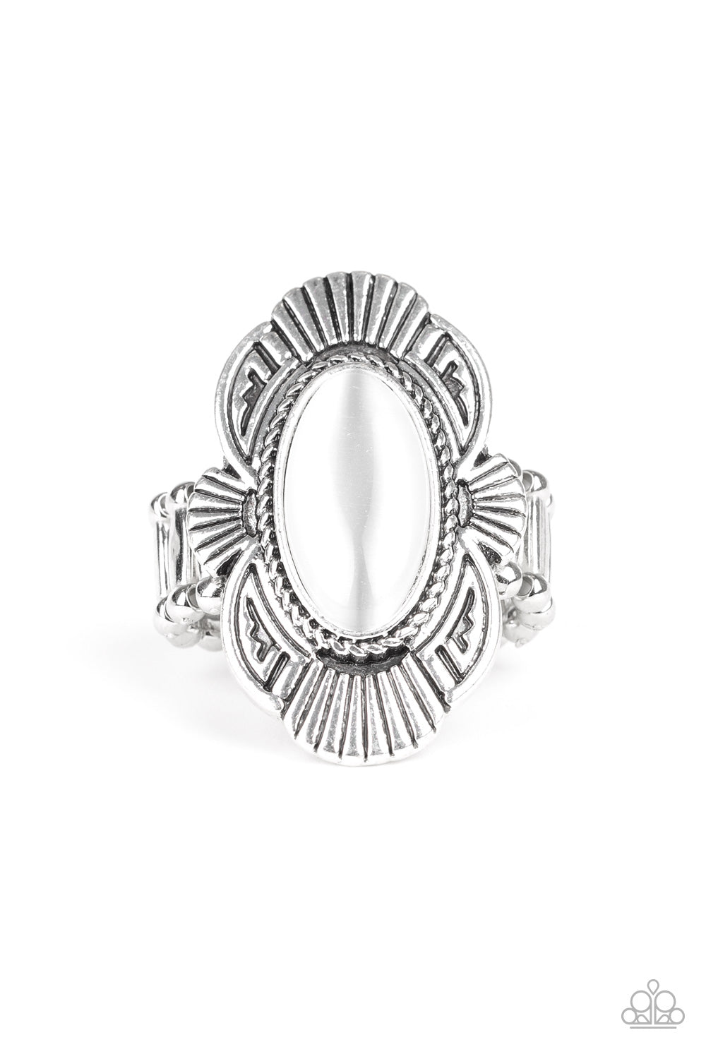 A white oval cat's eye stone is pressed into the center of a scalloped silver frame radiating with linear detail for a whimsical flair. Features a stretchy band for a flexible fit.