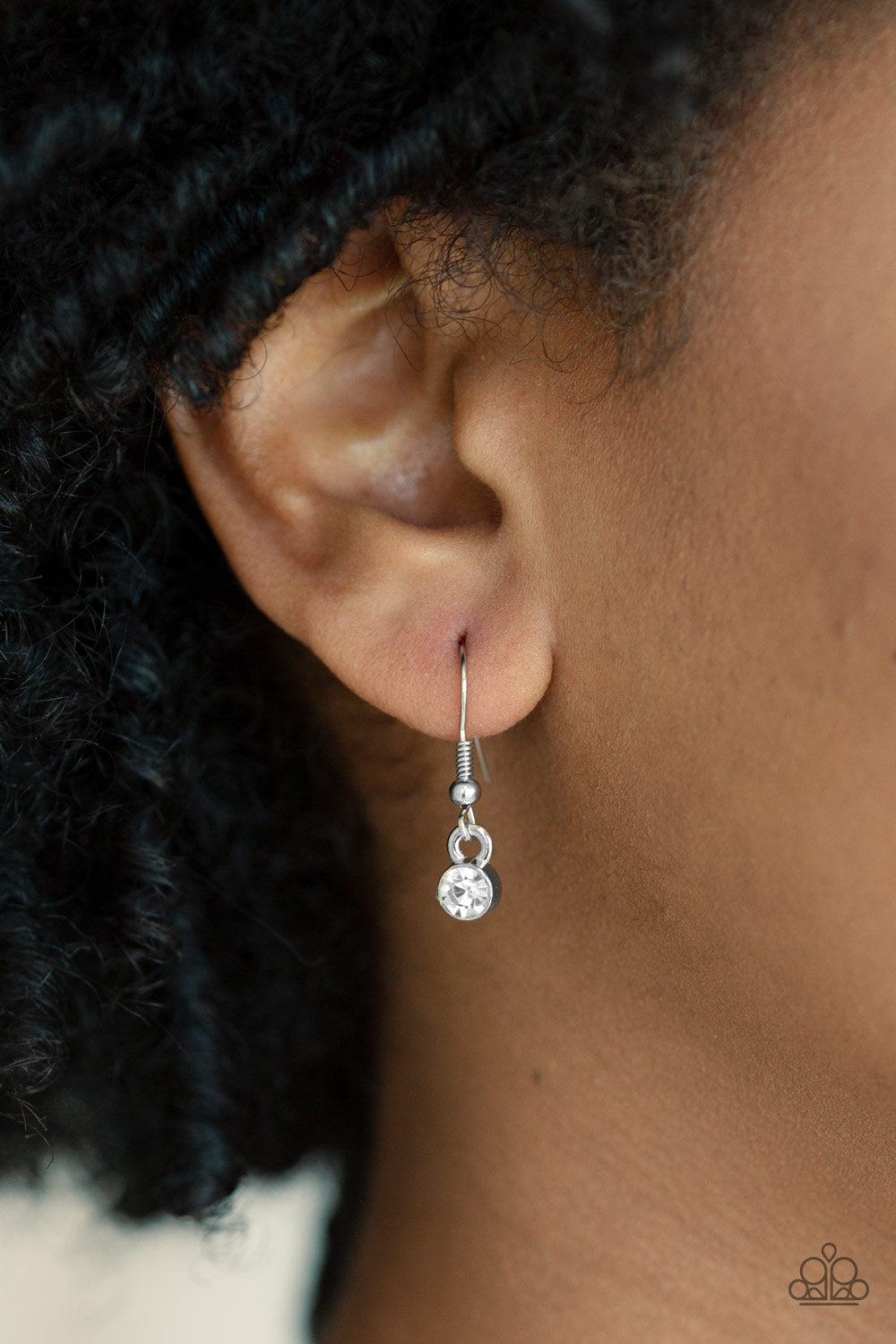 A white rhinestone encrusted square, a shimmery silver square, and a glowing green moonstone tumble down the chest, coalescing into a stylish pendant. Features an adjustable clasp closure.
