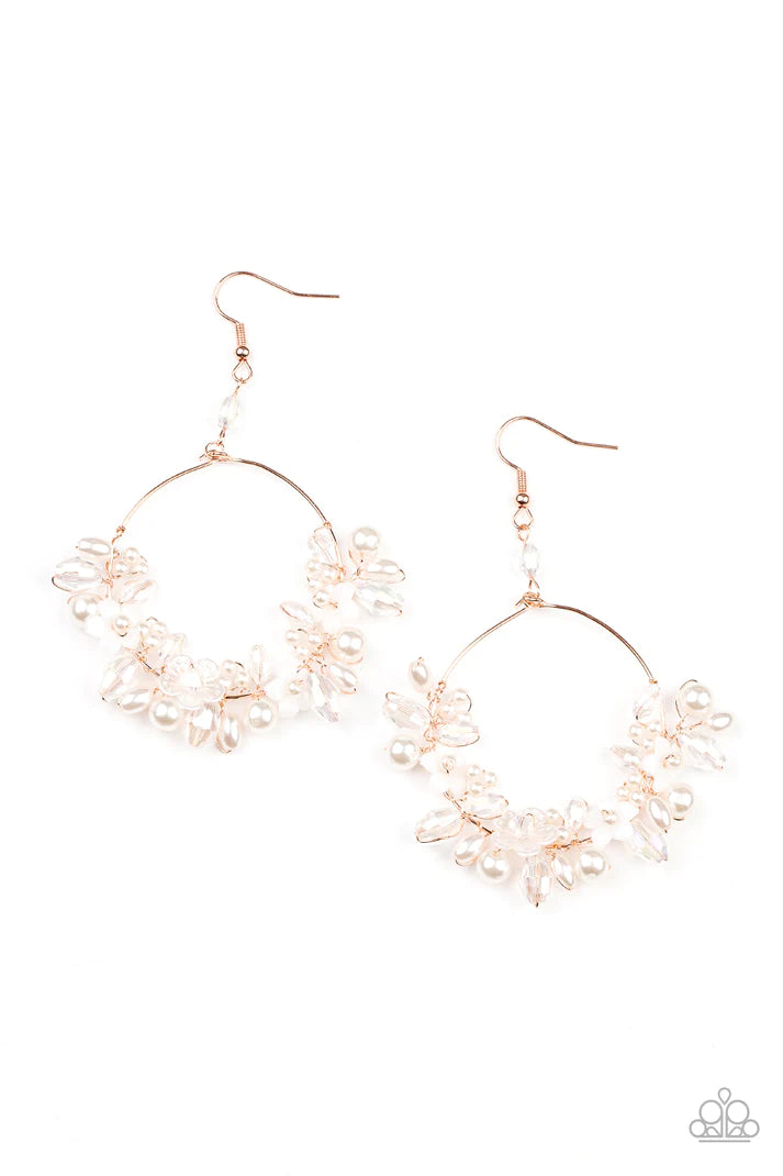 A timeless collection of iridescent crystal-like accents, dainty white pearls, and white floral frames delicately cluster along the bottom of a shiny copper hoop, creating a glamorous glow. Earring attaches to a standard fishhook fitting.