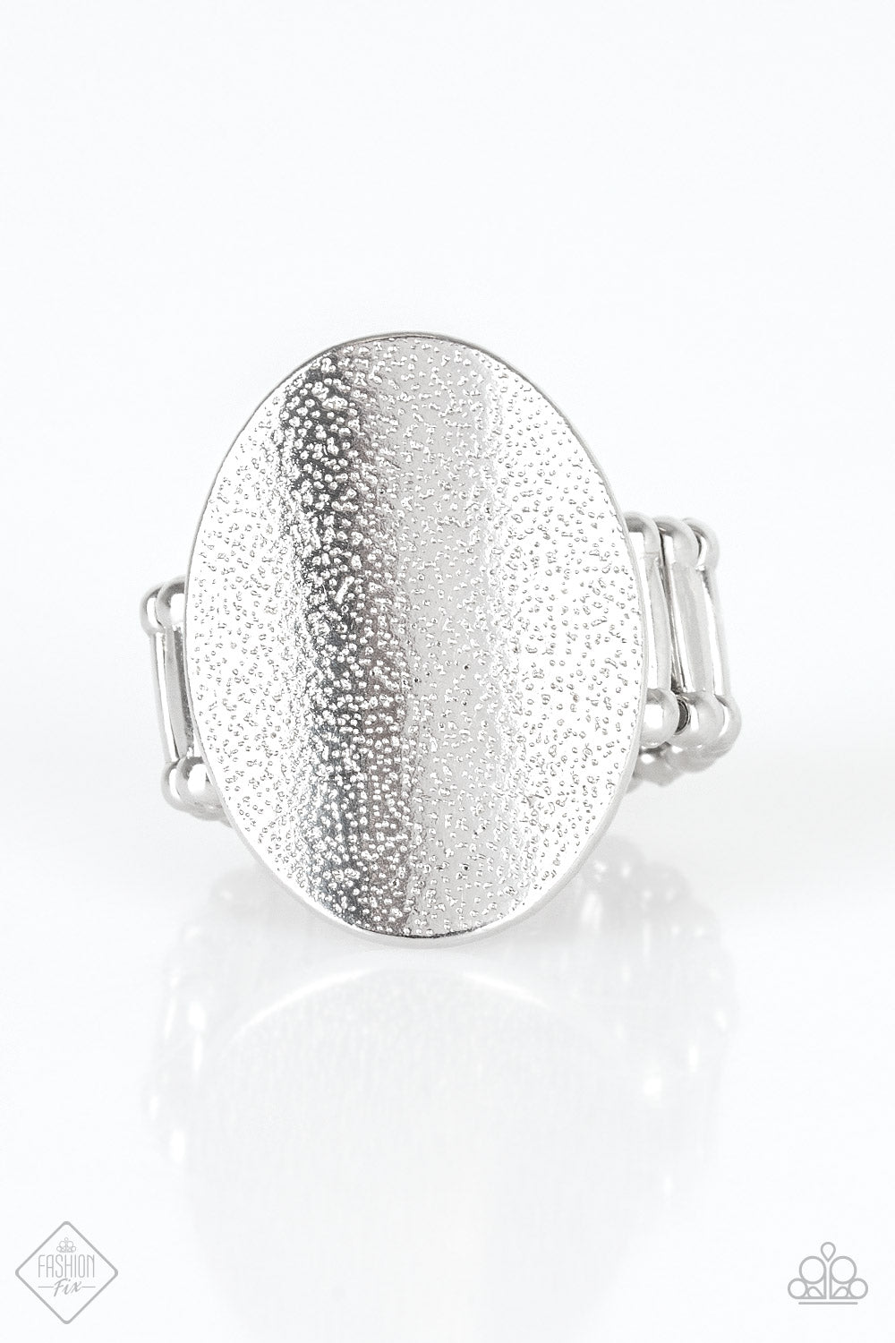 A flat silver oval brushed in endless glittery shimmer, sits atop the finger where it boldly catches and reflects the light. Features a stretchy band for a flexible fit.