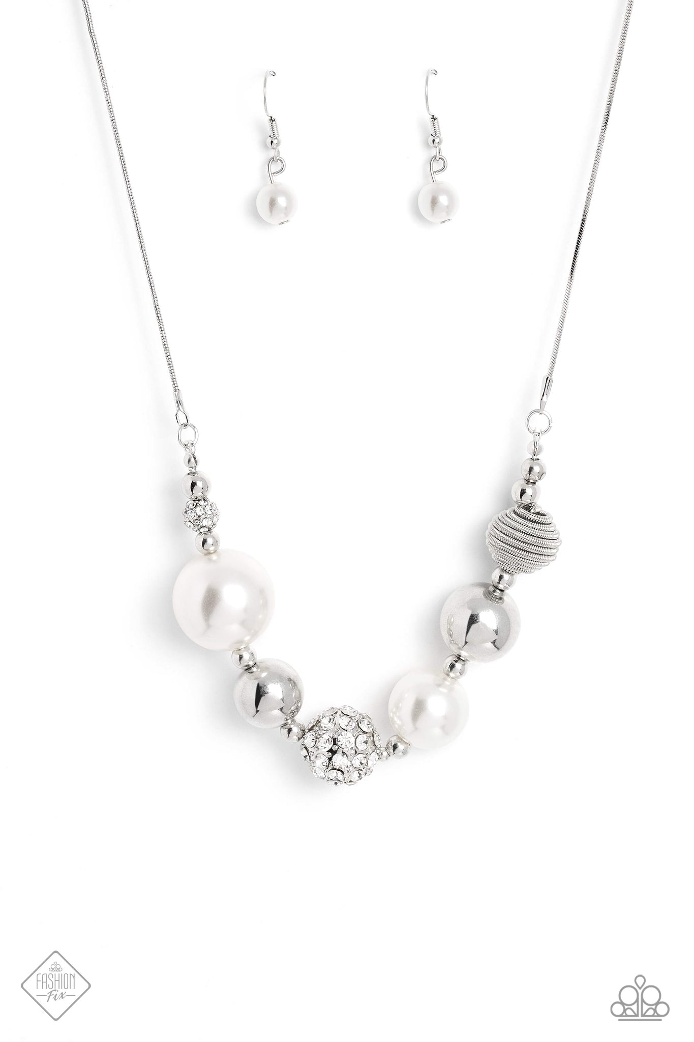 Exaggerated white pearls and silver beads, silver studs, a white rhinestone-encrusted sphere, and a silver ball with textured spirals dance along the collar, connecting to a silver serpentine chain in a showcase of glitz and elegance. Features an adjustable clasp closure.
