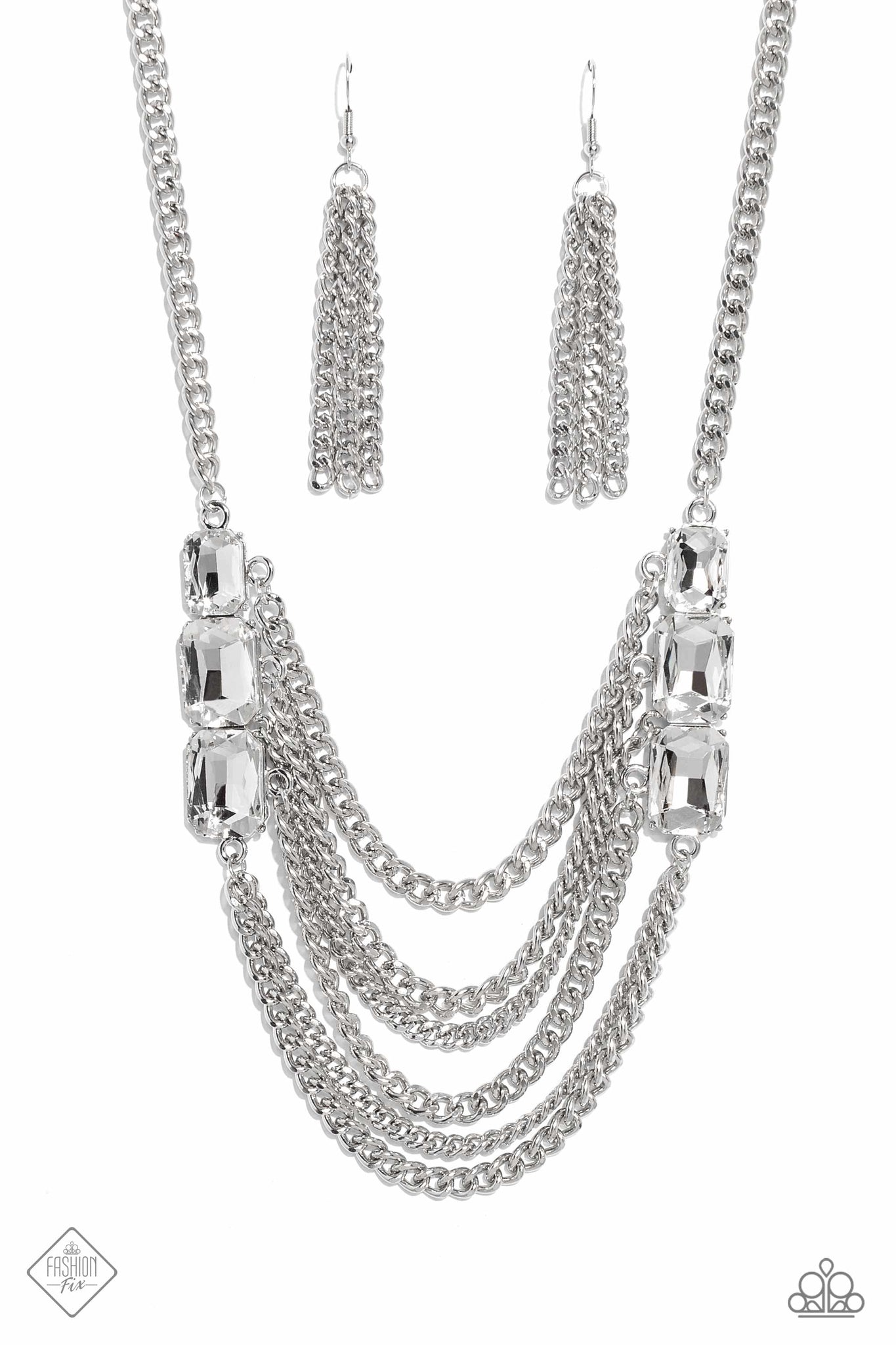 Layers of thick, silver curb chain drape across the chest, creating a fierce, industrial statement piece. Three blinding white, emerald-cut gems that gradually increase in size, are affixed to each side of the swooping chains, adding dramatic sparkle to the collision of grit and glitz. Features an adjustable clasp closure.