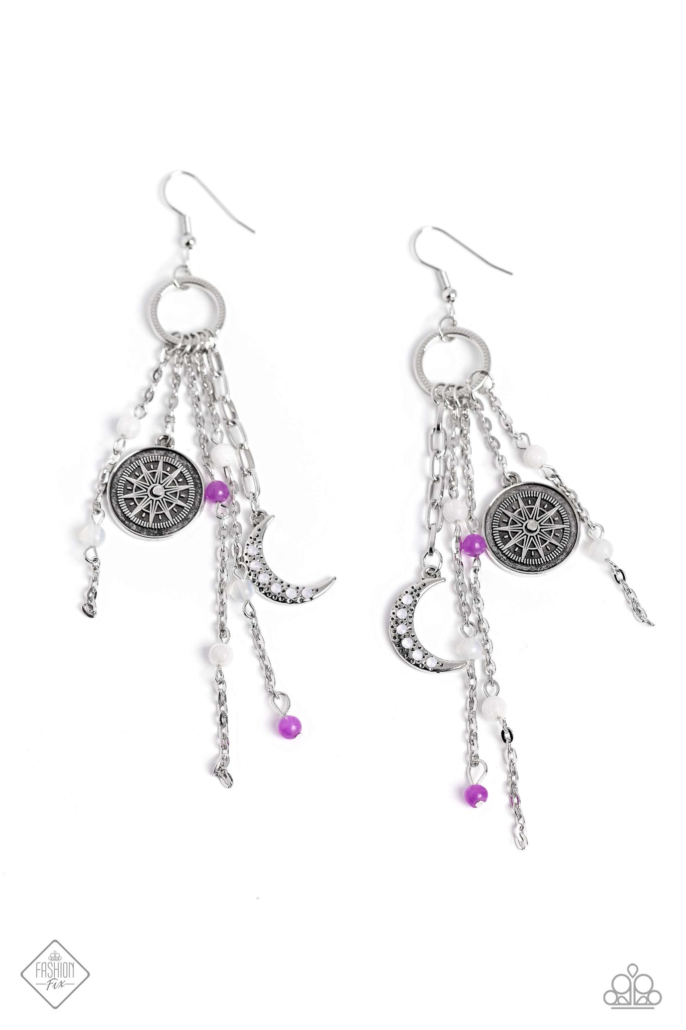 Featuring a shoulder-dusting length, an adventurous collection of amethyst and white stones, dainty opalescent beads, a silver moon encrusted with dainty opalescent beads, an antiqued silver disc embossed with compass details, and dainty silver chain links cascade from the bottom of a textured silver hoop, creating a whimsical fringe. Earring attaches to a standard fishhook fitting.