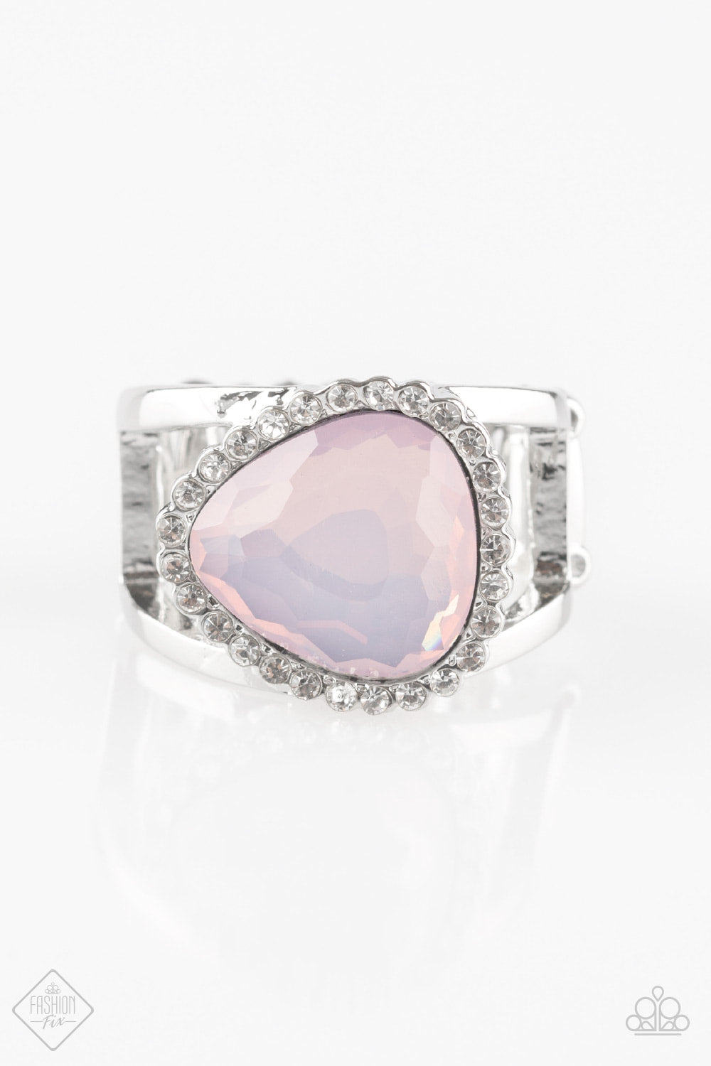 Featuring an opaque shimmer, a glassy pink gem is pressed into a sleek silver frame encrusted in dainty white rhinestones for a whimsical look. Features a stretchy band for a flexible fit. Sold as one individual ring.