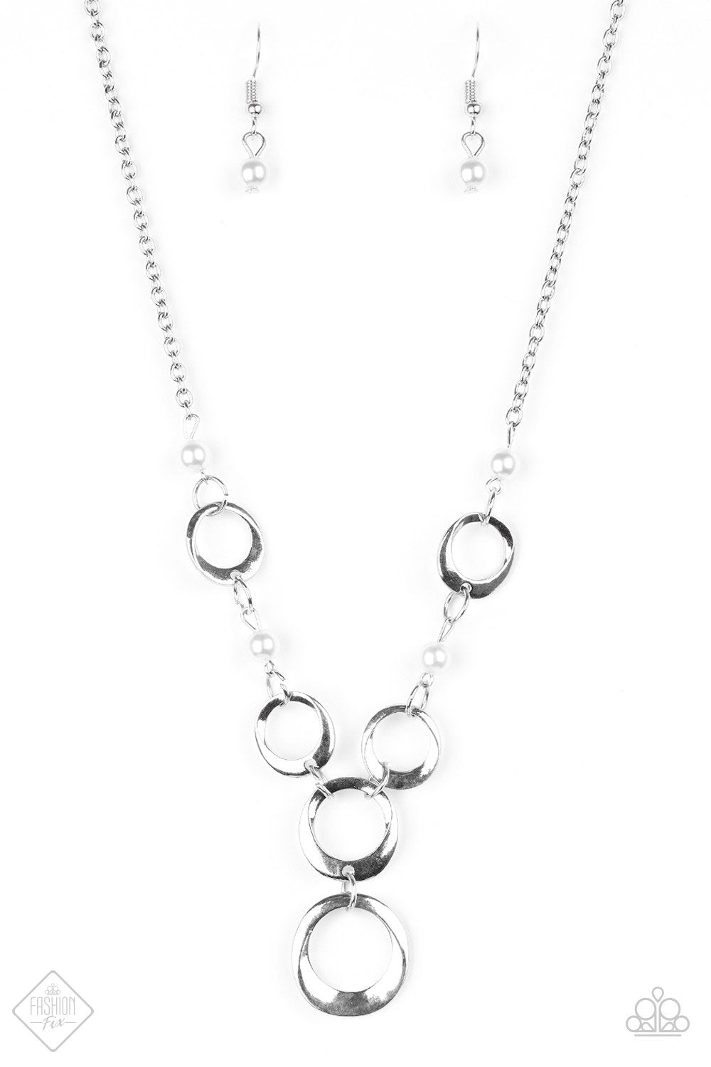 Asymmetrical silver hoops connect with pearly white beads below the collar for a refined look. Features an adjustable clasp closure.