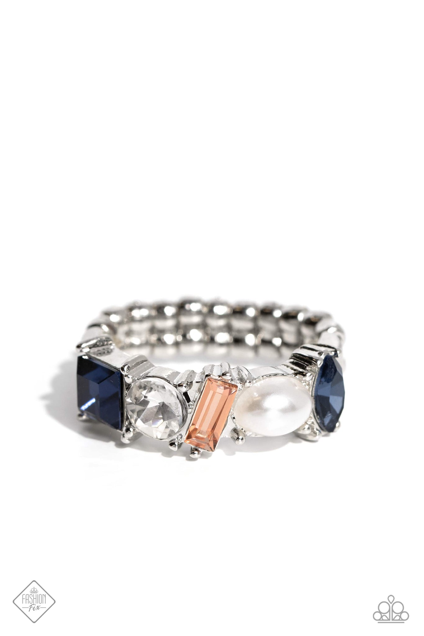 Held in place by thick, silver, pronged fittings, various glassy peach, white, and blue gems, and a glossy white pearl fall in line along a dainty silver bar atop the finger for a refined statement. Features a dainty stretchy band for a flexible fit.