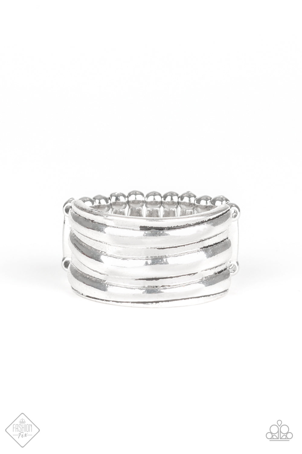 Brushed in a high-sheen finish, ribbed silver bands stack across the finger for an edgy industrial look. Features a stretchy band for a flexible fit.