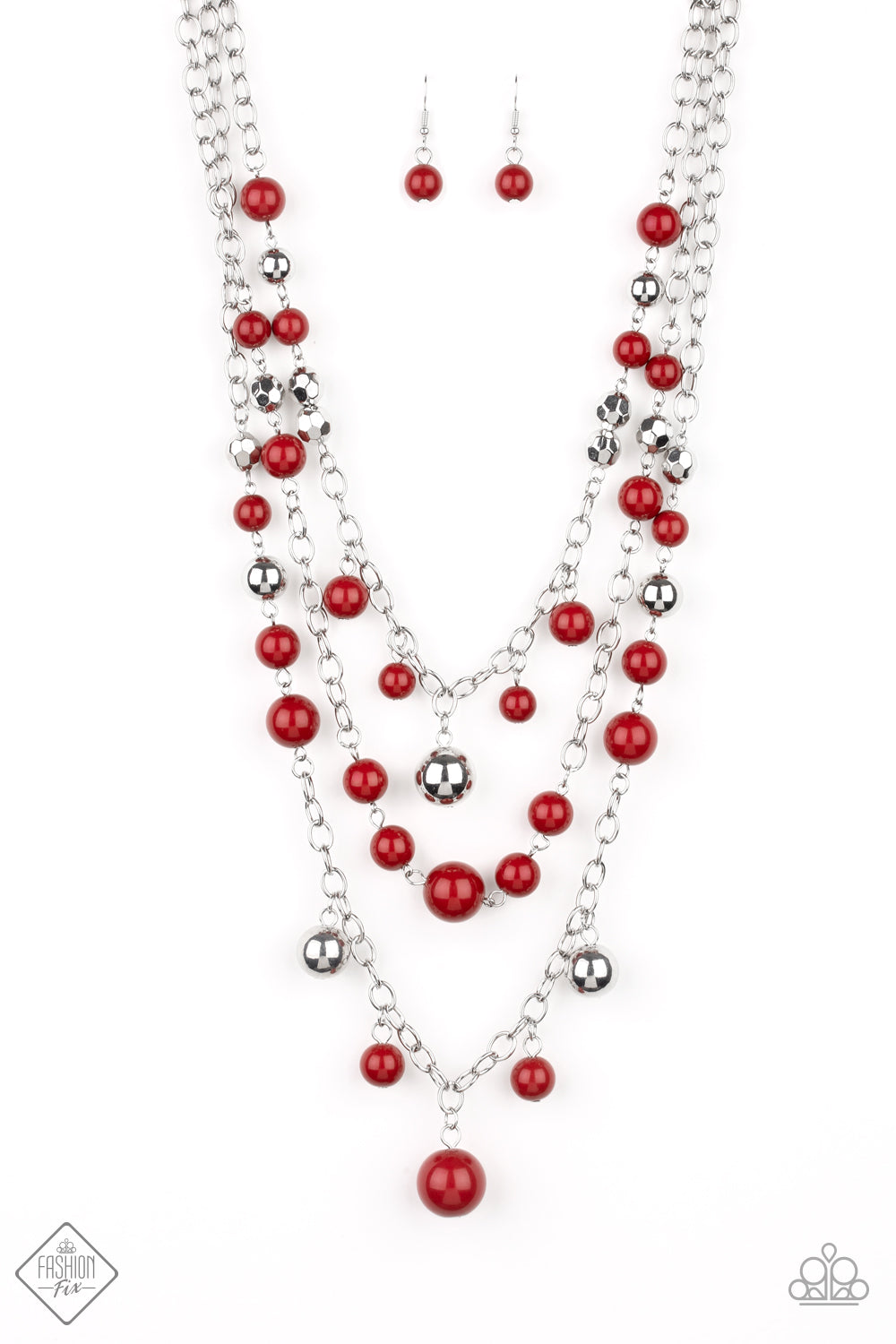 Three silver chains layer down the chest, creating a cascade of shimmer. Beads tinted in a deep red wine hue are mixed with timeless metallic accents that dance along the chains in a colorful statement-making finish. Features an adjustable clasp closure.