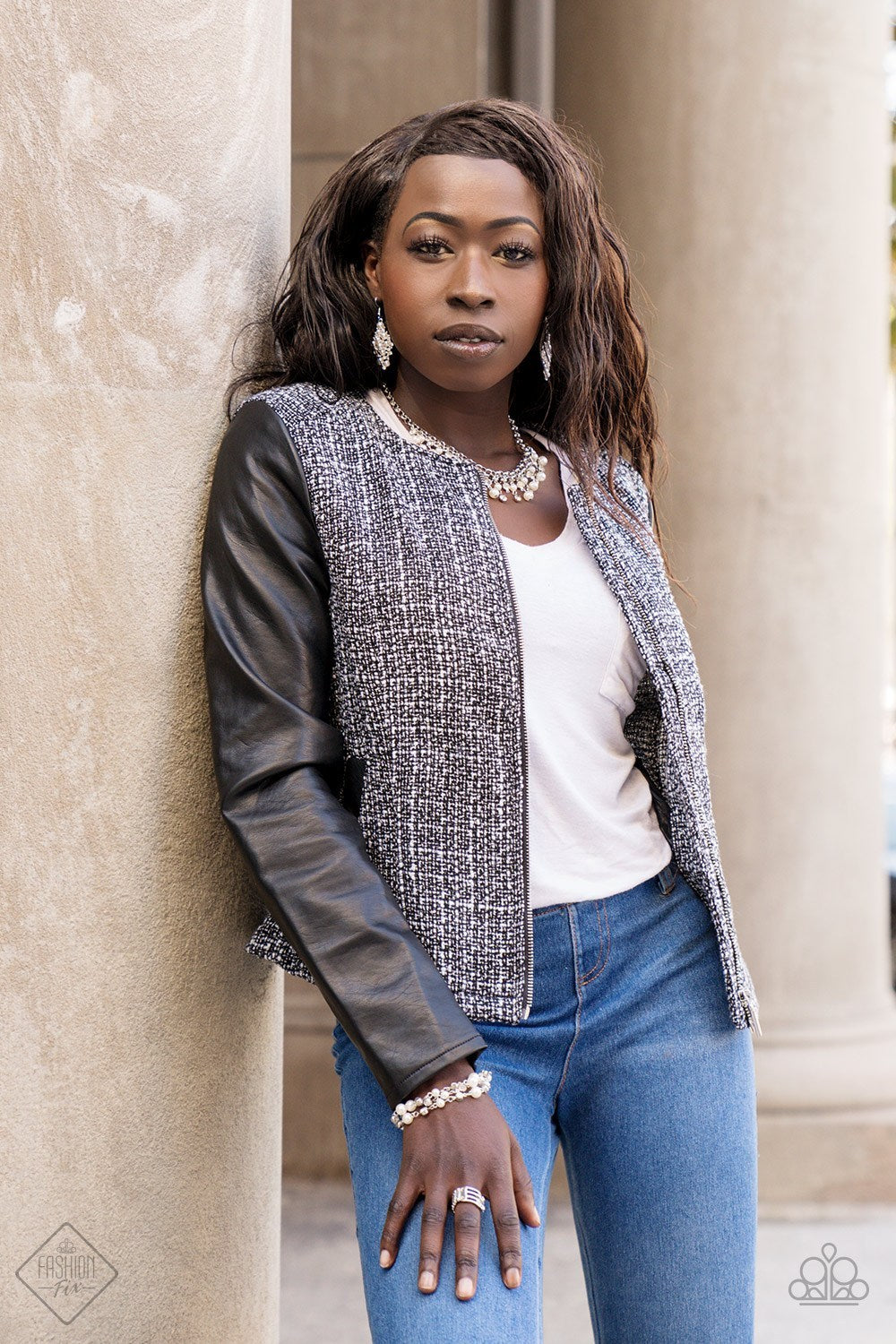 Glittery white rhinestones and classic white pearls swing from the bottom of interlocking silver chains, creating a bubbly fringe below the collar. Features an adjustable clasp closure.