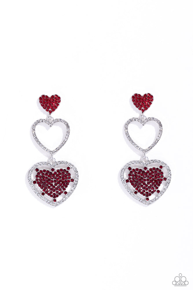 A red rhinestone-encrusted silver heart, white rhinestone-encrusted silver heart frame, and white and red rhinestone-encrusted layered heart frame gradually increase in size as they delicately interconnect and stack into a dazzling lure for an elegant effervescence. Earring attaches to a standard post fitting. Sold as one pair of post earrings.