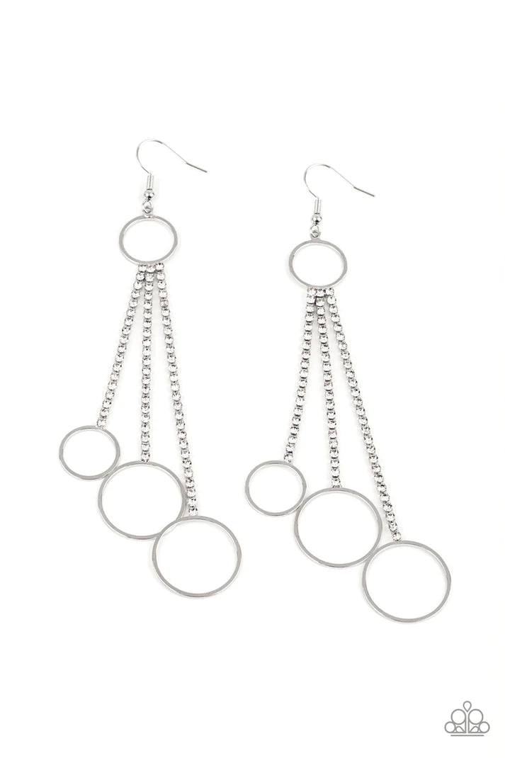 Dainty silver hoops swing from the bottom of glittery strands of glassy white rhinestones that attach to the bottom of a dainty silver ring, creating a tantalizing tassel. Earring attaches to a standard fishhook fitting.