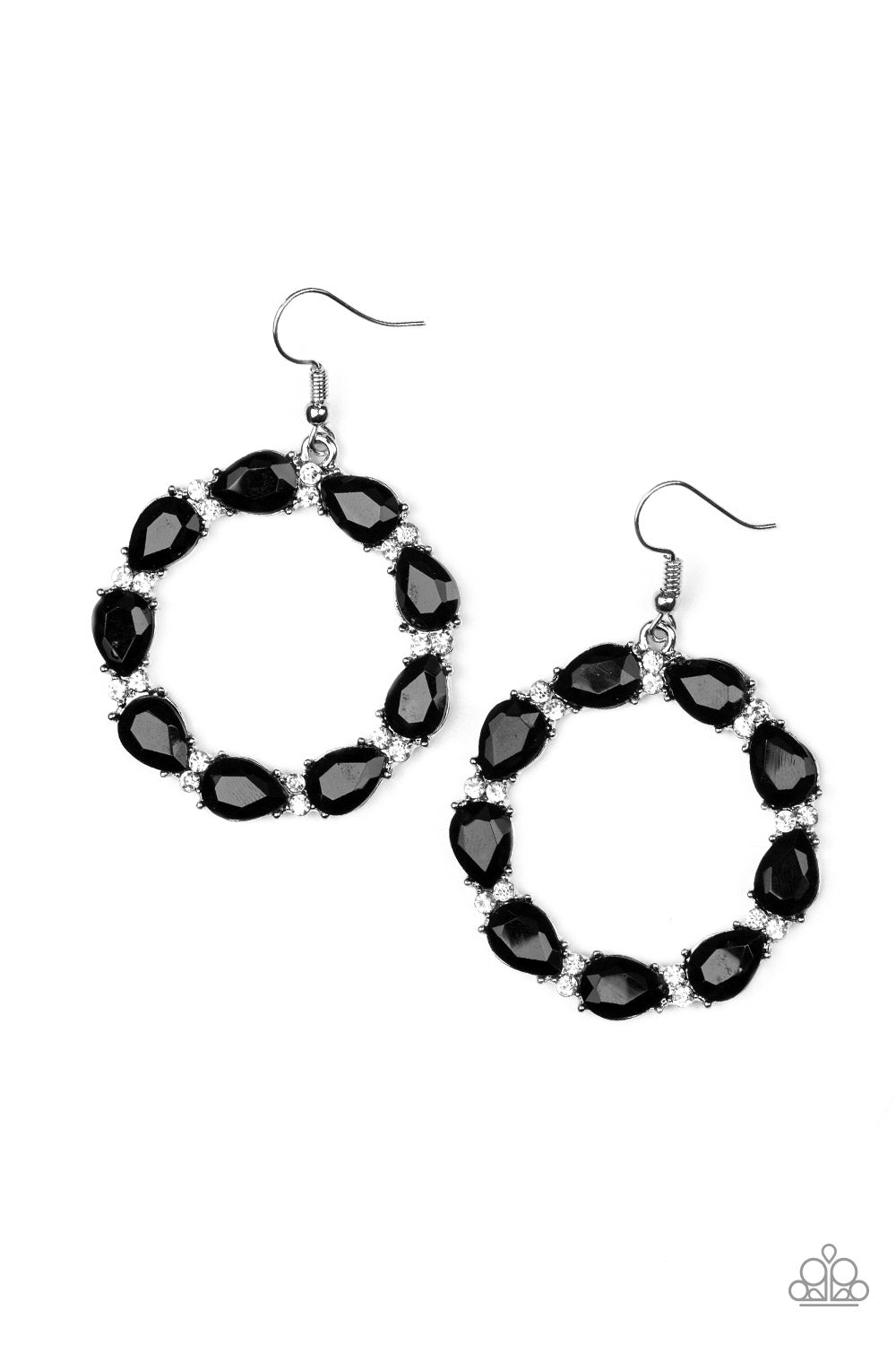 Glittery white rhinestones and black teardrop gems circle into a sparkling hoop for a glamorous look. Earring attaches to a standard fishhook fitting.