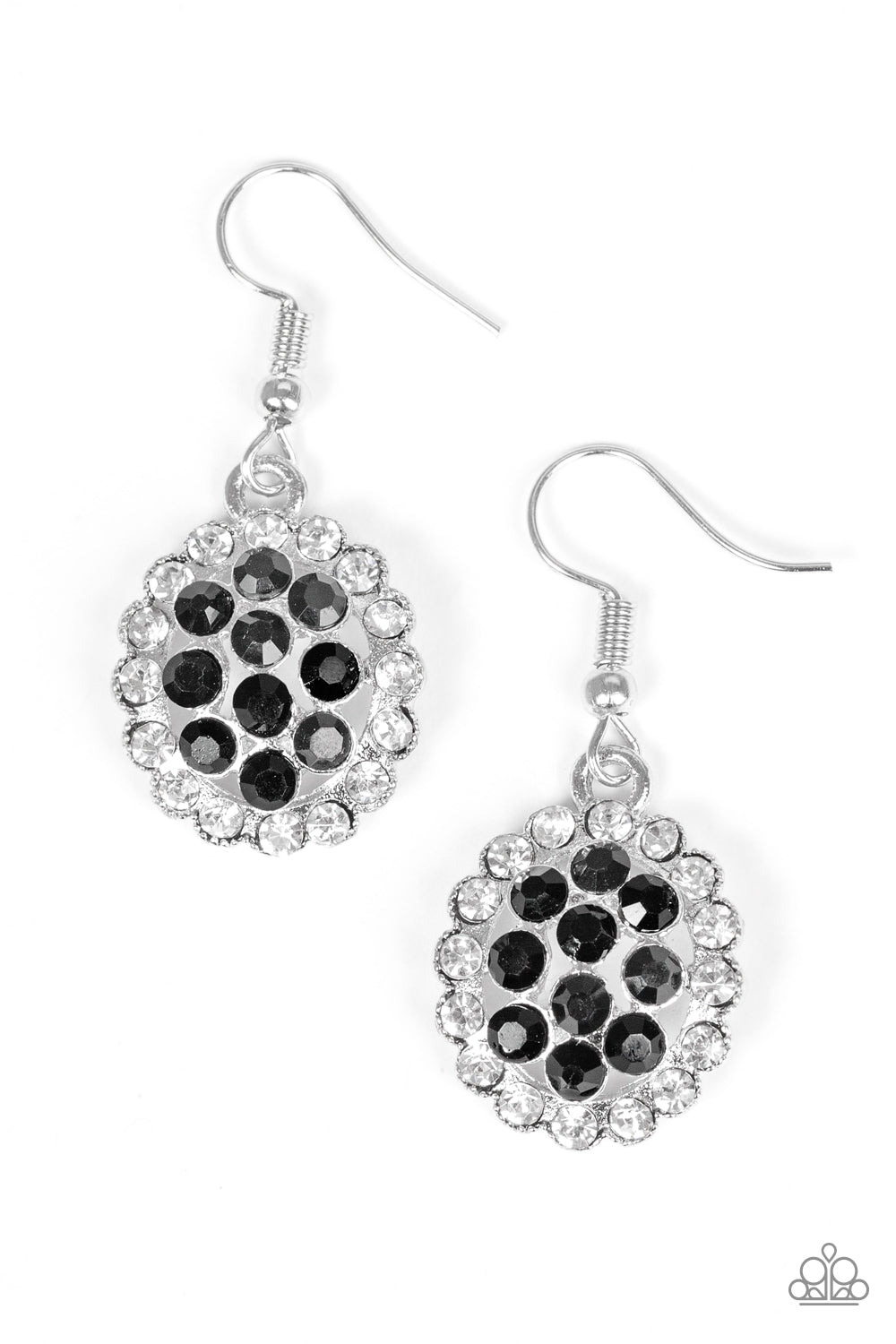 Dazzling white and black rhinestones are encrusted across a round silver frame, creating a blinding palette. Earring attaches to a standard fishhook fitting.