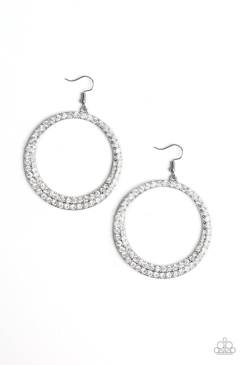 An oversized silver hoop is encrusted in glittery white rhinestones for a blinding shimmer. Earring attaches to a standard fishhook fitting.