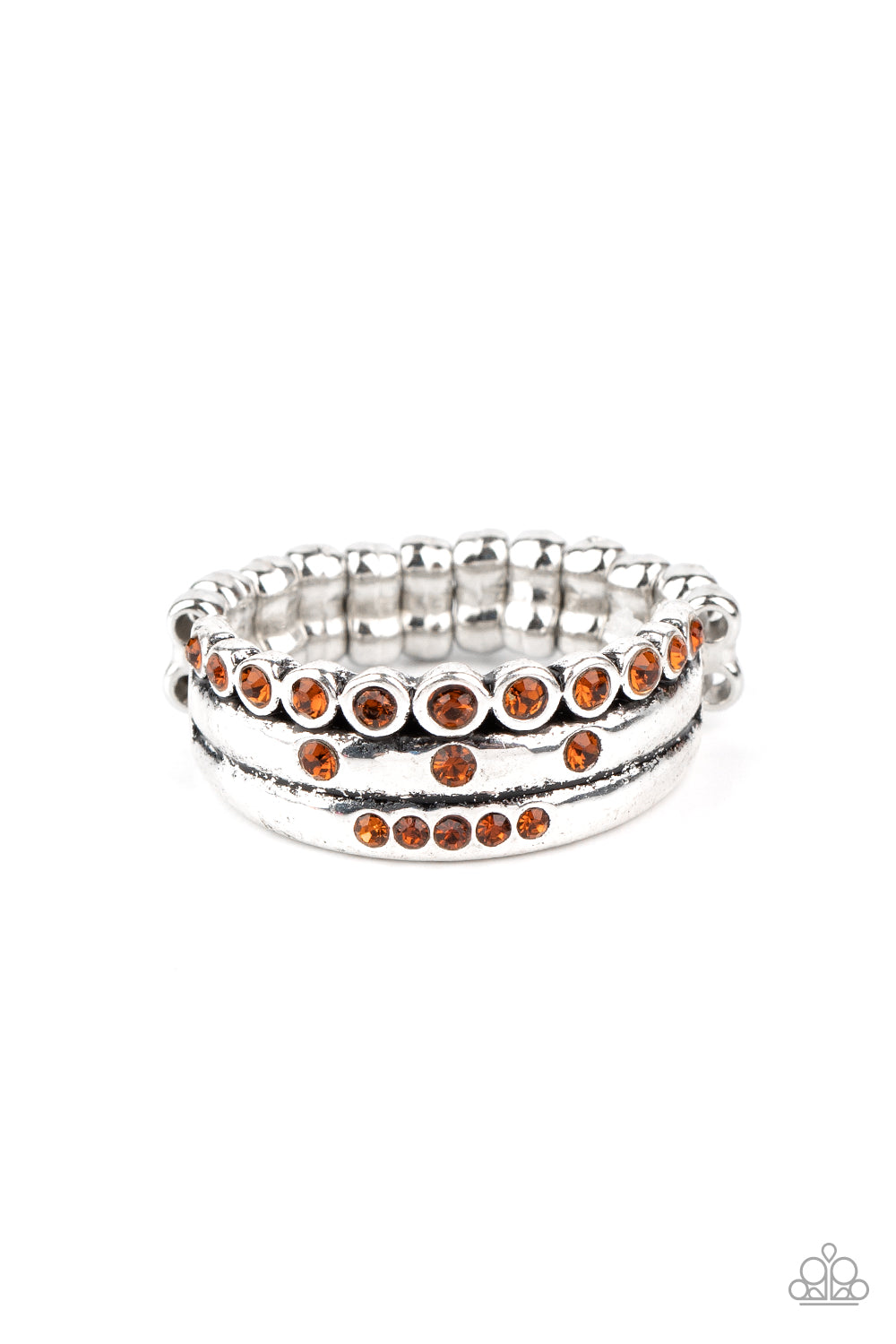Sporadically dotted in glittery topaz rhinestones, three dainty silver bands layer across the finger for an exceptionally sparkly look. Features a dainty stretchy band for a flexible fit.