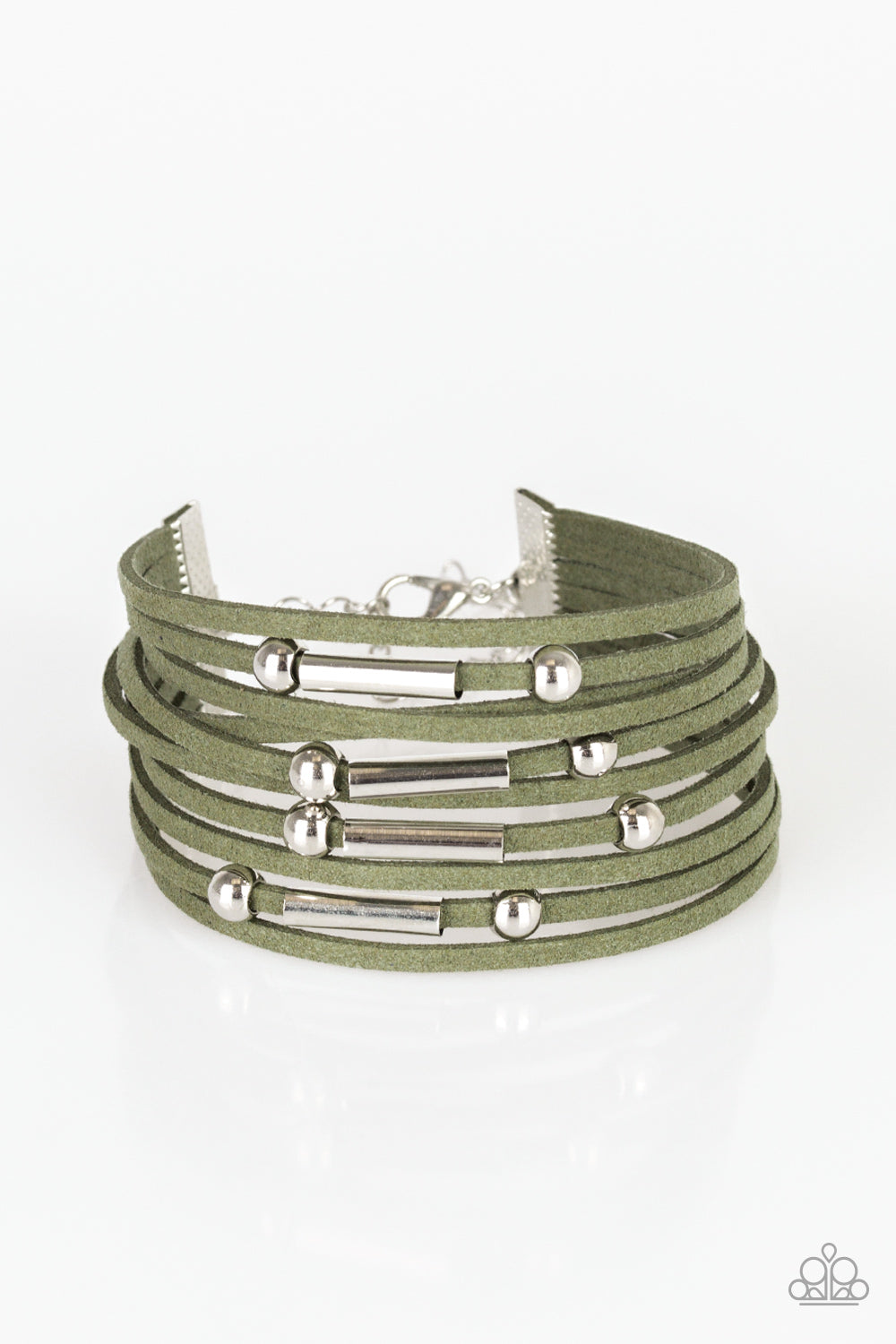 Dainty silver beads and shiny silver accents slide along rows of earthy green suede for a seasonal look. Features an adjustable clasp closure.