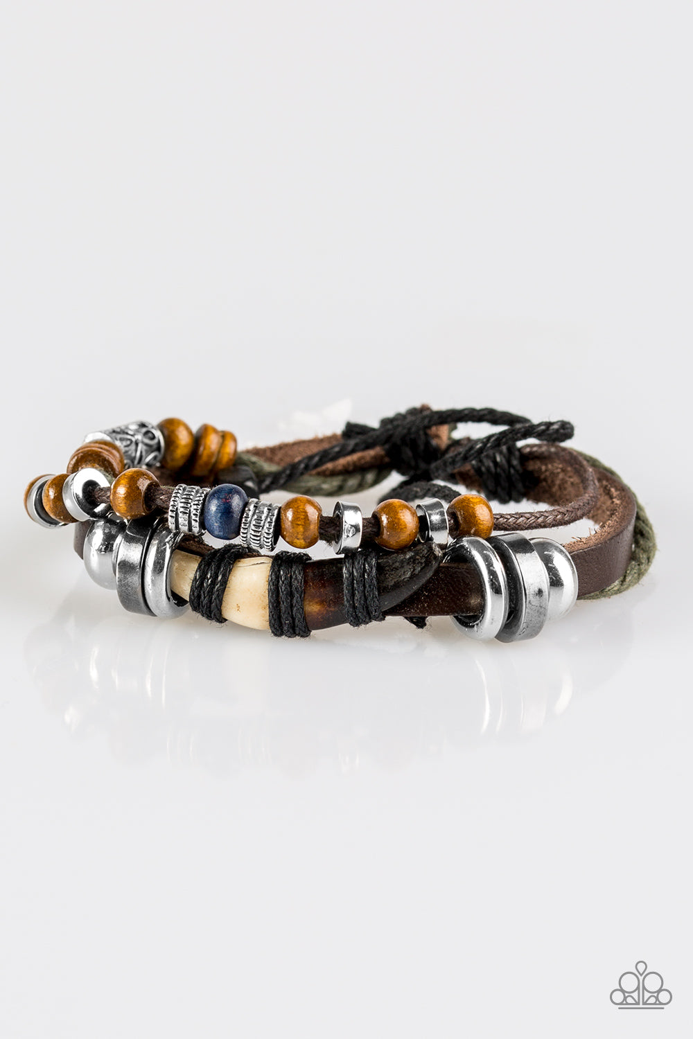 Mismatched metal accents and wooden beads are threaded along strands of twine and leather. Brushed in an iridescent finish, a talon-like centerpiece is knotted in place across the front of the leather band for an earthy finish. Features an adjustable sliding knot closure.