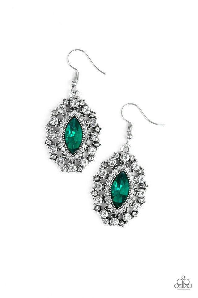 Featuring a regal marquise style cut, a glittery green rhinestone is pressed into a studded silver frame radiating with glassy white rhinestones for a timeless look. Earring attaches to a standard fishhook fitting.