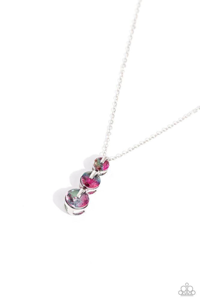 Featuring a UV finish, a collection of blue, green, and pink gems are set in elevated, pronged silver fittings as they gradually increase in size along a dainty silver chain to create a prismatic, ombré display. Features an adjustable clasp closure. Sold as one individual necklace. Includes one pair of matching earrings. #P2DA-GRXX-130XX