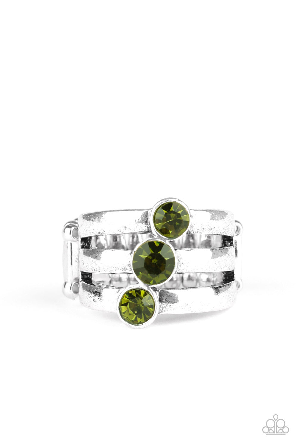 A trio of green rhinestones slant across three stacked silver bands, coalescing into a refined centerpiece. Features a stretchy band for a flexible fit.