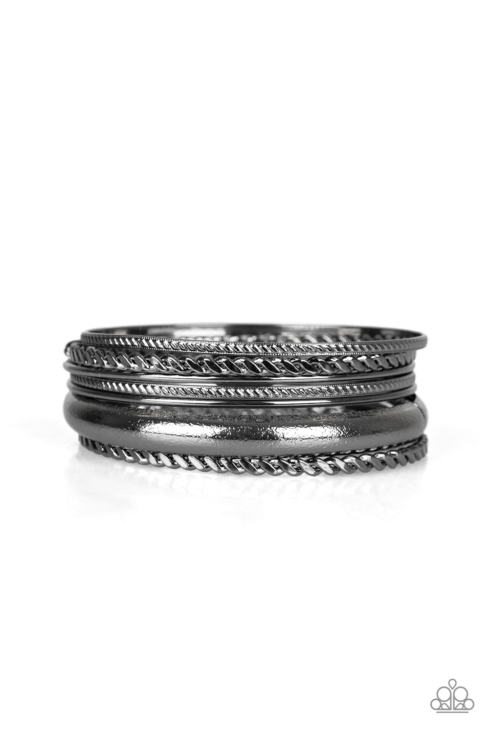 Varying in shape and texture, a collision of gunmetal bangles slide up and down the wrist for a casual look.