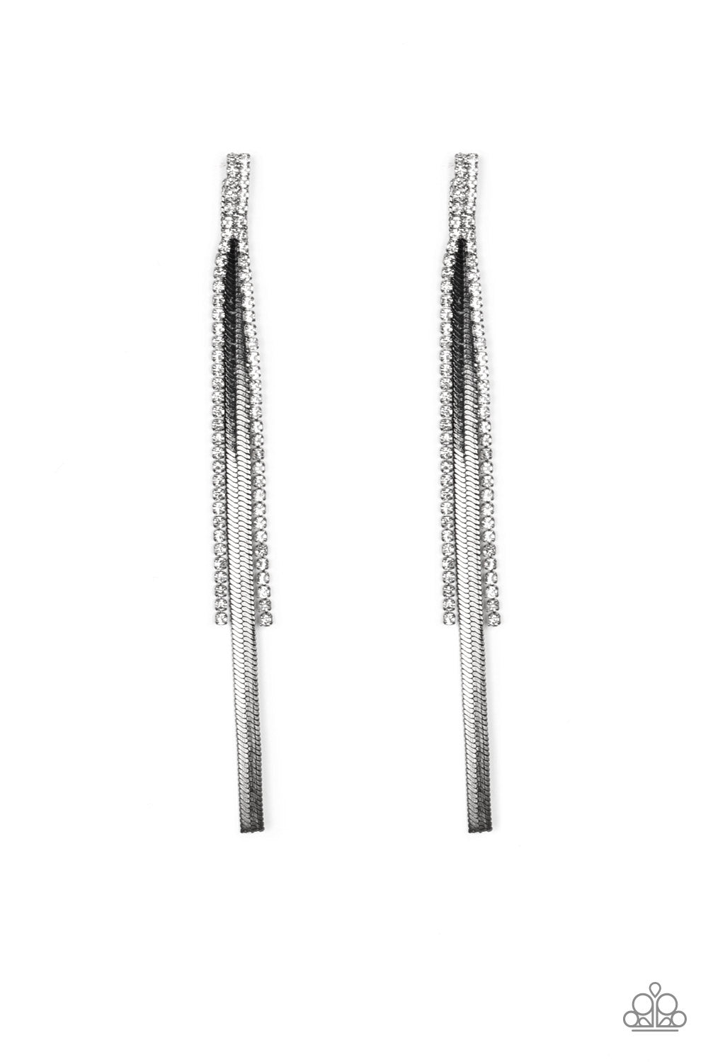 Two strands of dainty white rhinestones join a flat gunmetal chain, coalescing into an edgy lure. Earring attaches to a standard post fitting.