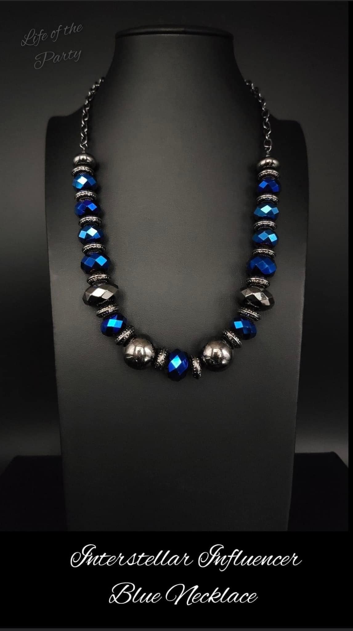 A dramatic assortment of oversized gunmetal beads, textured gunmetal rings, and faceted metallic blue gems delicately glides along an invisible wire below the collar, resulting in a stellar sparkle. Features an adjustable clasp closure.