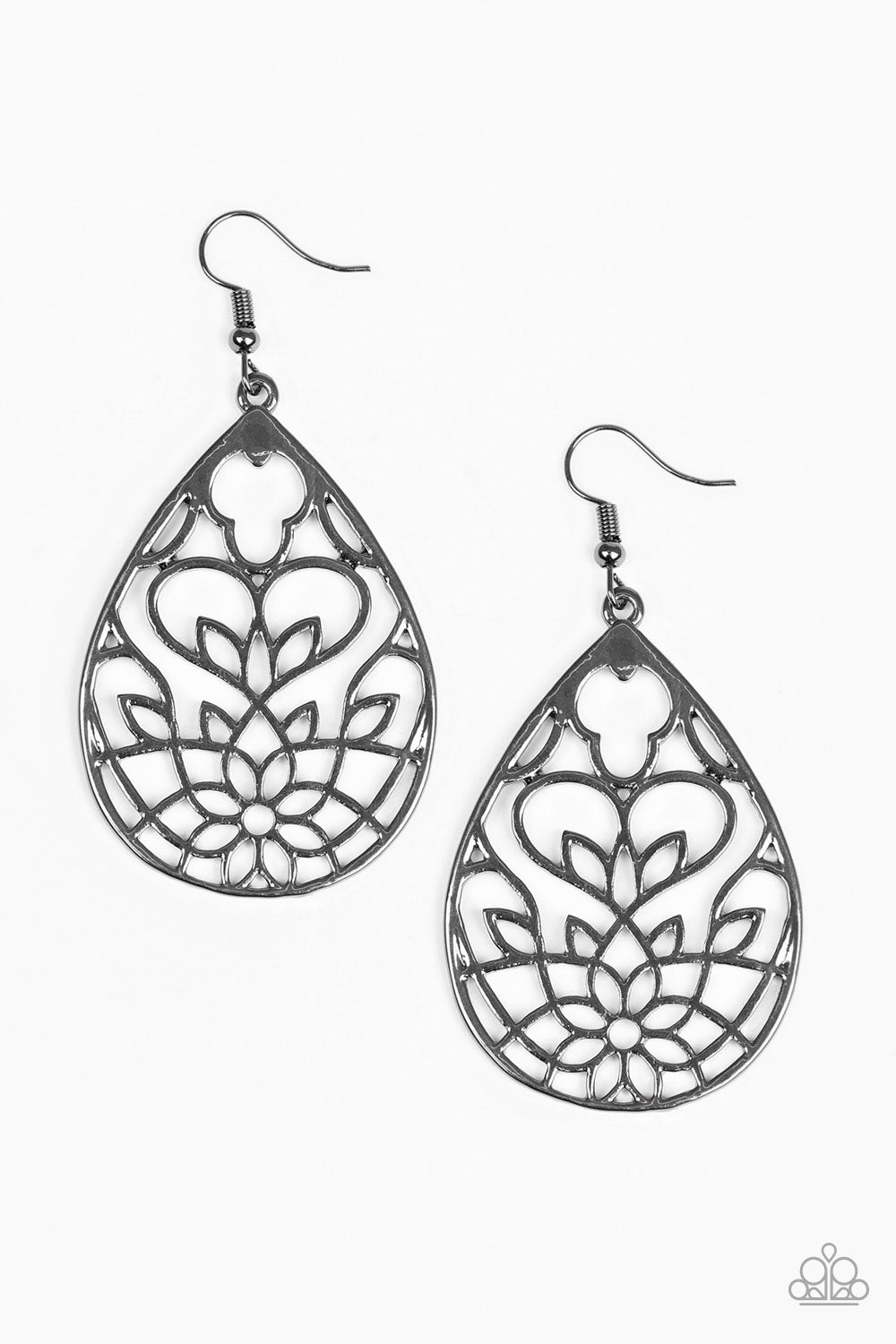 Glistening gunmetal filigree swirls inside of an airy gunmetal teardrop frame, whirling into a whimsical lotus pattern for a seasonal look. Earring attaches to a standard fishhook fitting.