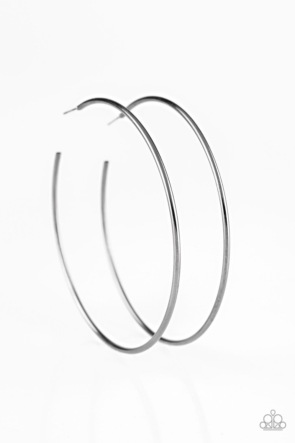 A skinny ribbon of gunmetal curls into a bold hoop for a dramatic look. Earring attaches to a standard post fitting. Hoop measures 3” in diameter.