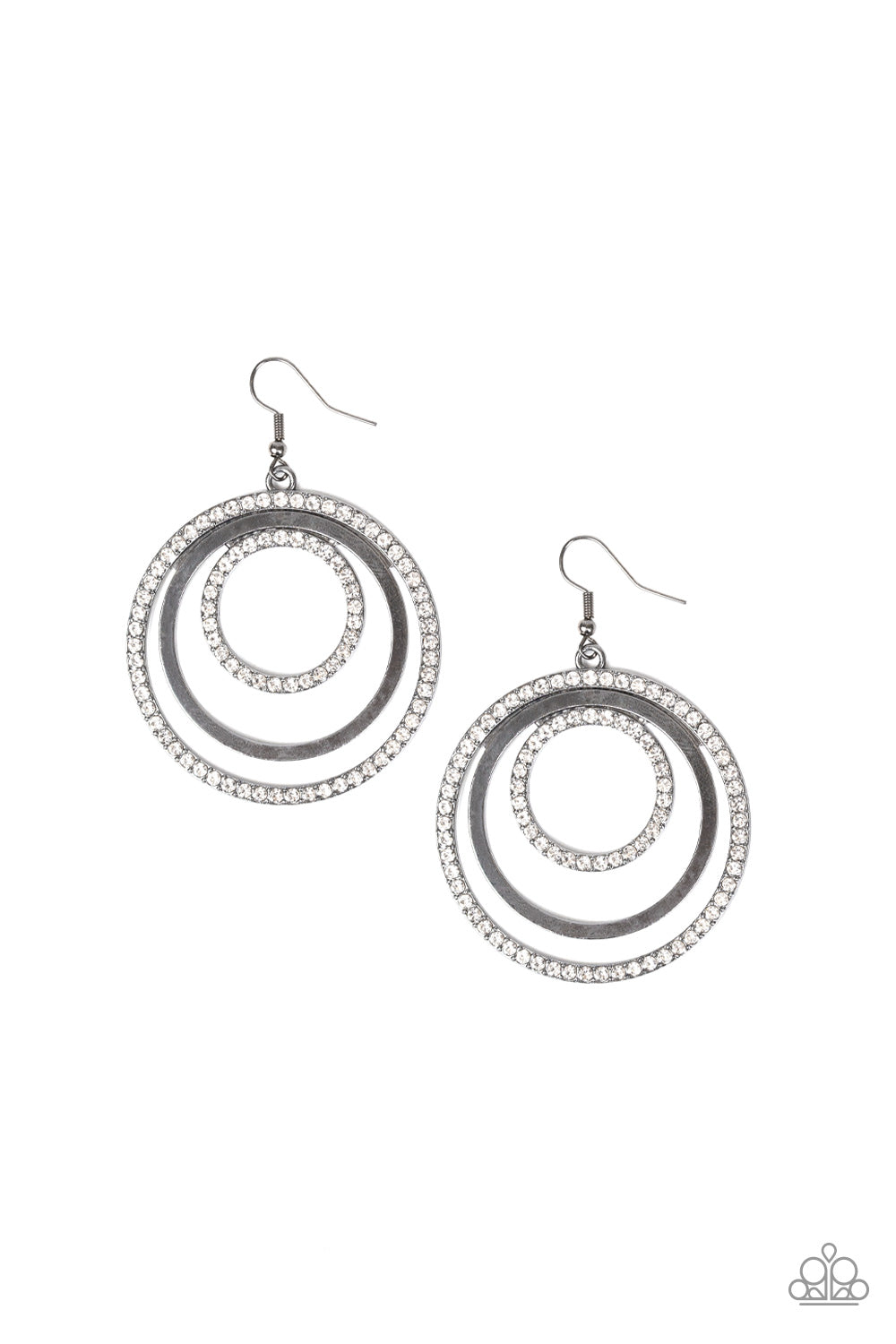 Glittery hematite rhinestone encrusted silver hoops flank a glistening silver hoop as they ripple from the ear for a refined flair. Earring attaches to a standard fishhook fitting.
