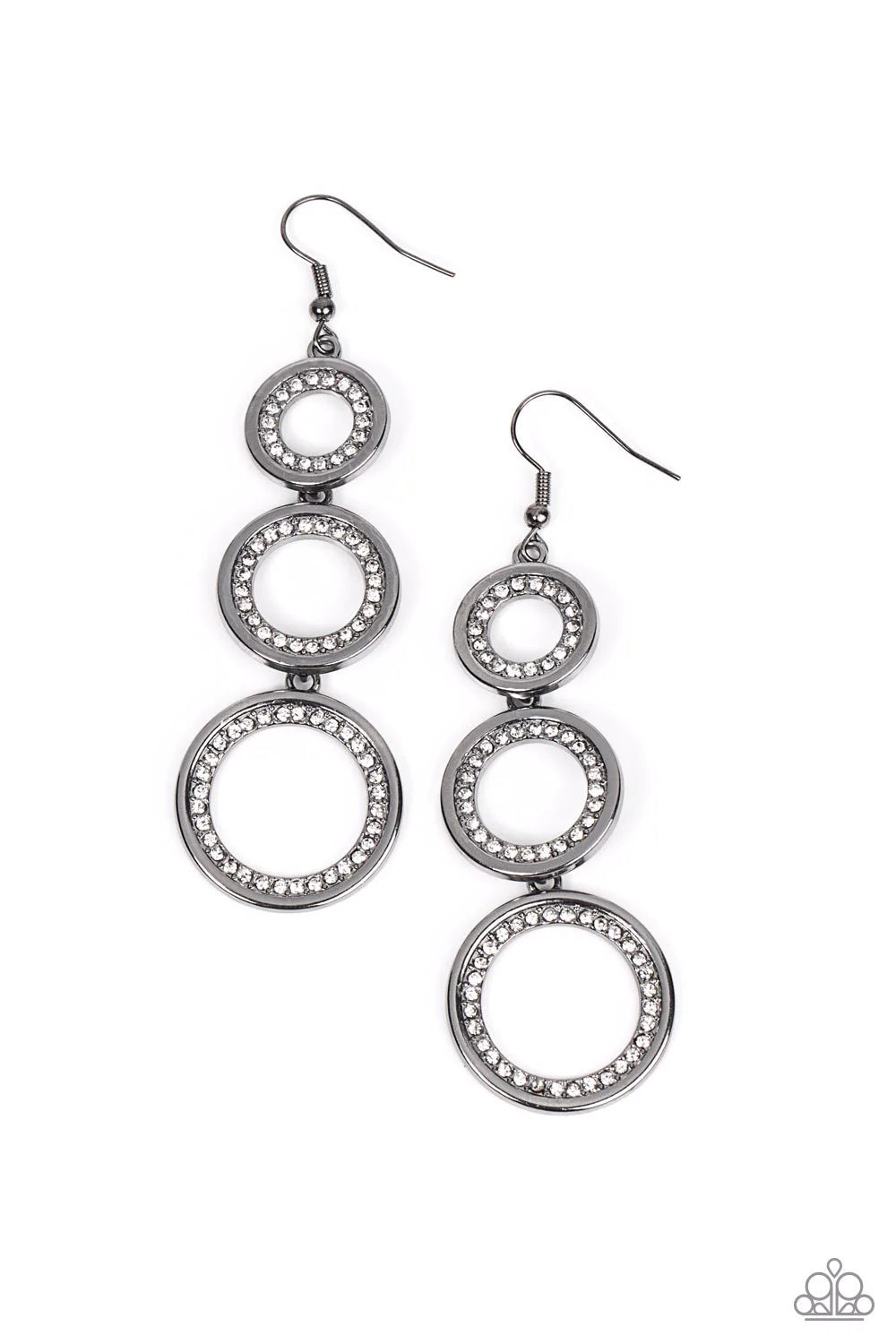 Gradually increasing in size, inner rings of white rhinestones radiate inside glistening gunmetal hoops that link into an elegant lure. Earring attaches to a standard fishhook fitting.