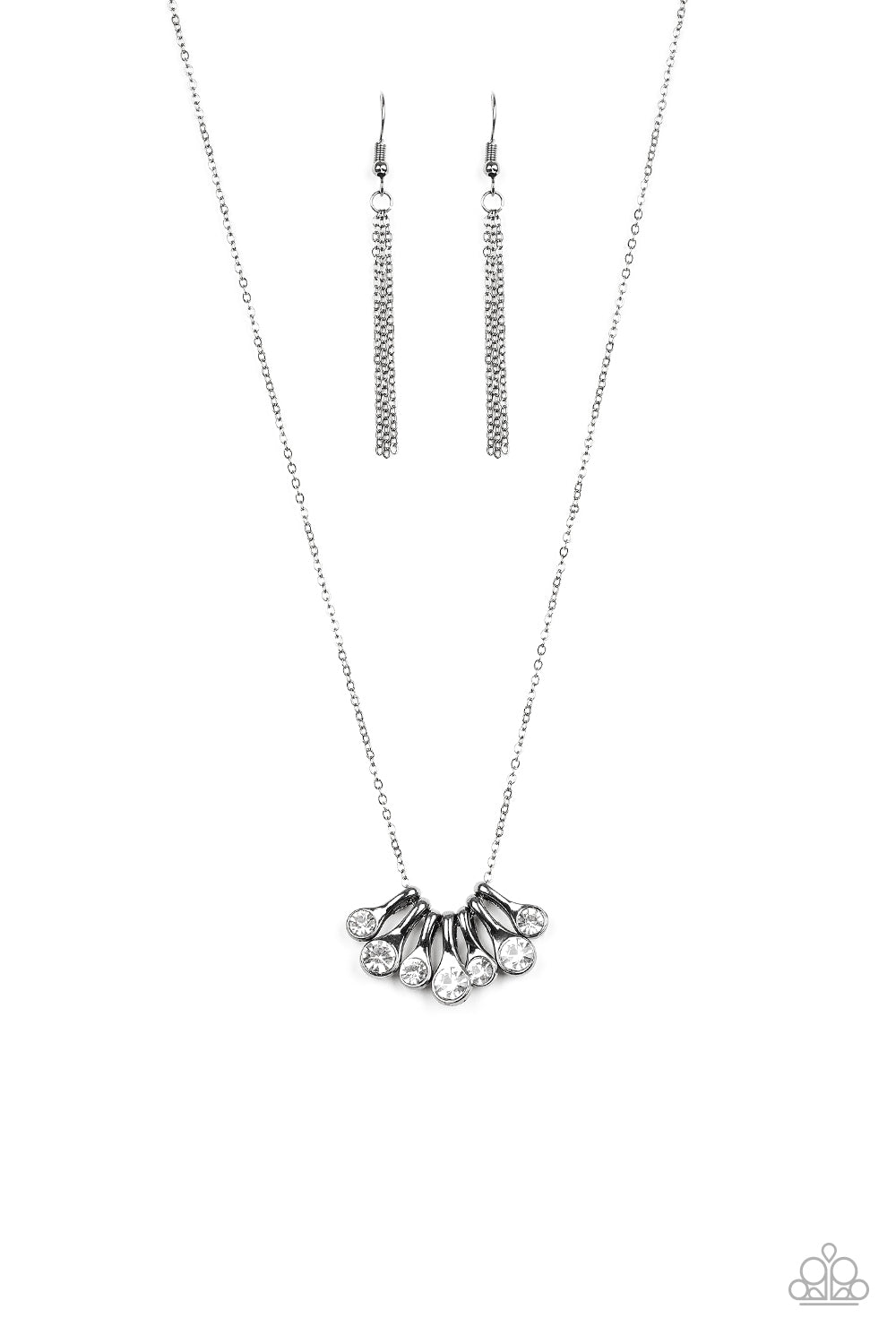 Dotted with dainty white rhinestones, a collection of shimmery gunmetal frames slide along a dainty gunmetal chain below the collar for a timeless look. Features an adjustable clasp closure.