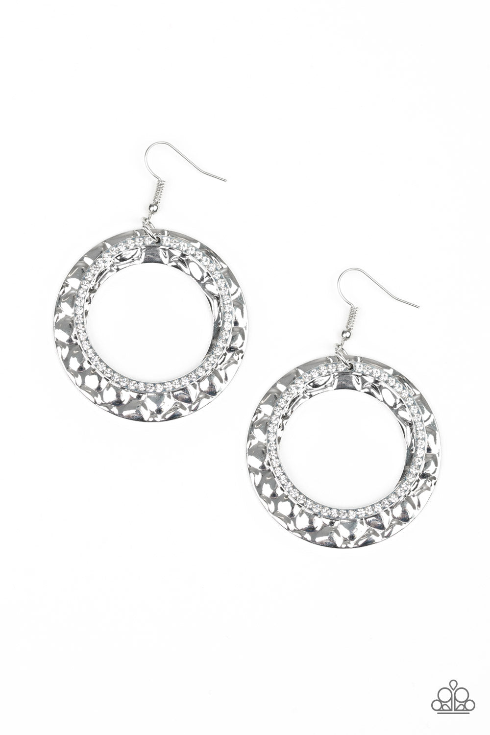 Encrusted in glassy white rhinestones, a glittery silver hoop links with a thick silver hoop embossed in metallic pebble-like patterns, creating a refined lure. Earring attaches to a standard fishhook fitting.