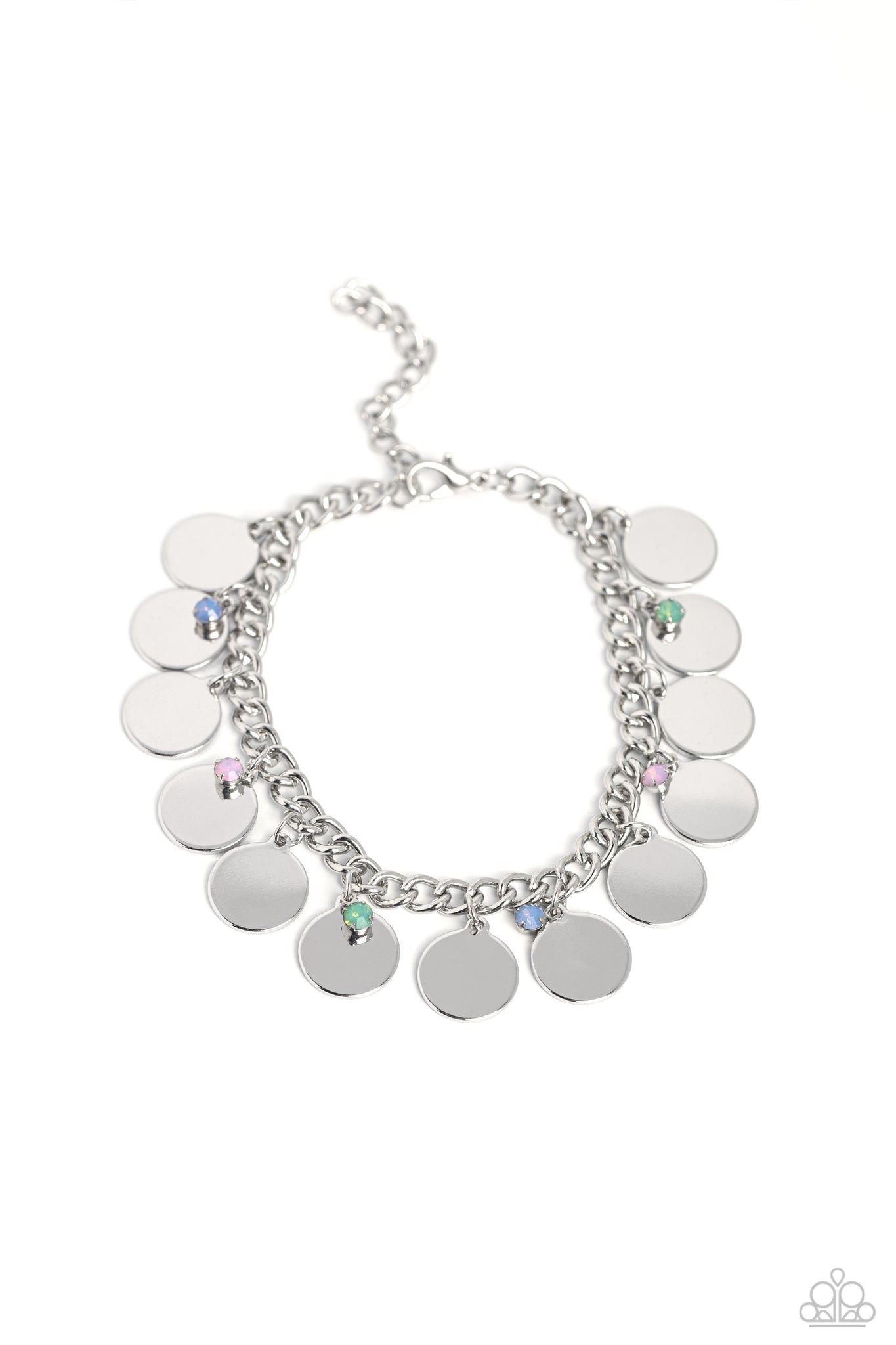 Dainty, opalescent pink, blue, and green beads dance along a silver chain alongside high-sheen silver discs for an understated girly design. Features an adjustable clasp closure.