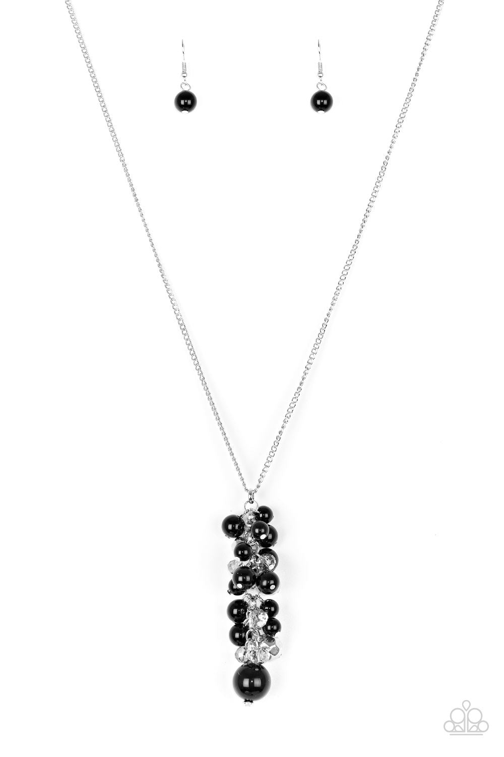 Mismatched black beads, white crystal-like beads, and faceted silver beads cascade from the bottom of an elongated silver chain, creating a refined clustered tassel. Features an adjustable clasp closure.
