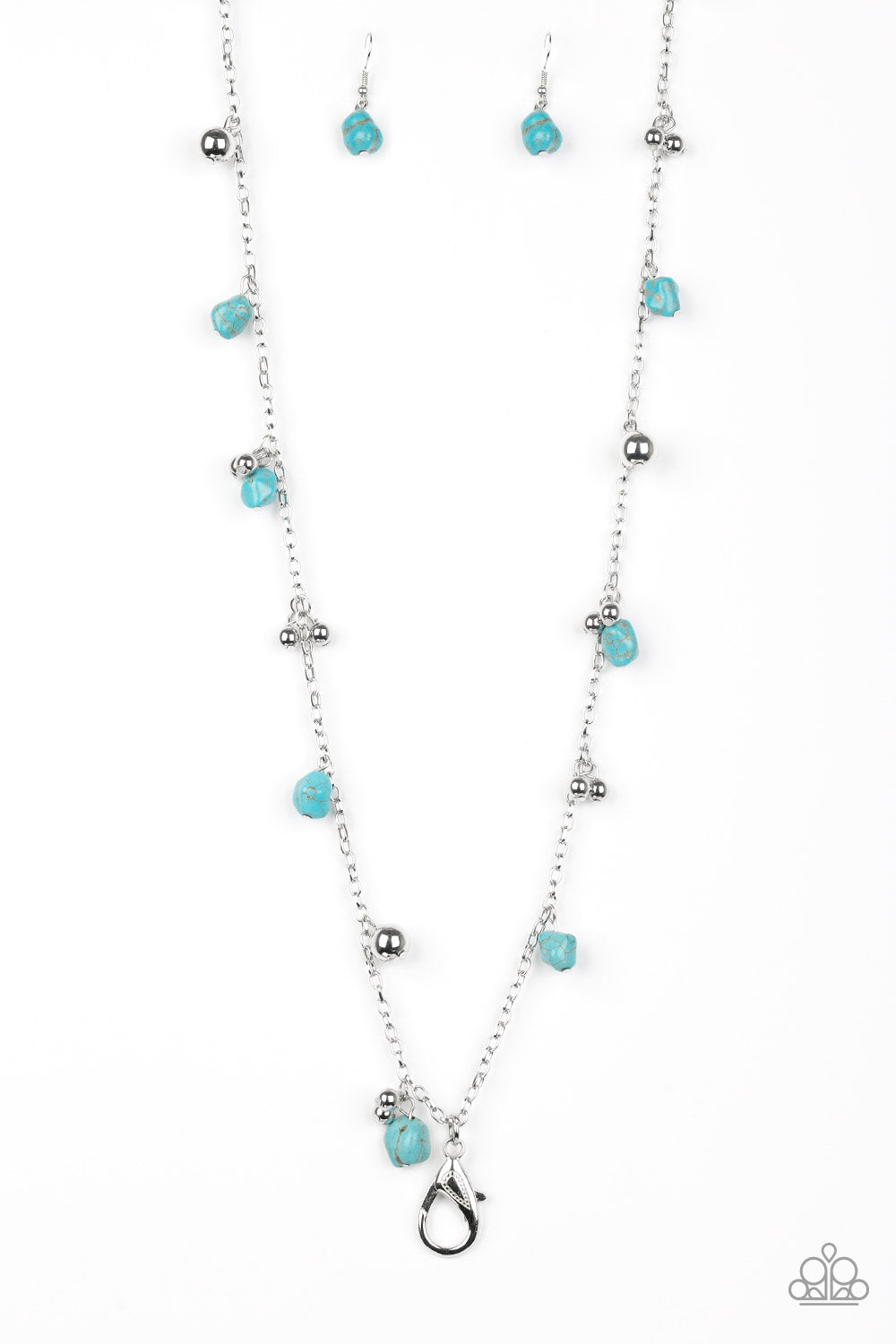 Refreshing turquoise pebbles and an array of glistening silver beads trickle along a lengthened silver chain for a seasonal look. A lobster clasp hangs from the bottom of the design to allow a name badge or other item to be attached. Features an adjustable clasp closure.