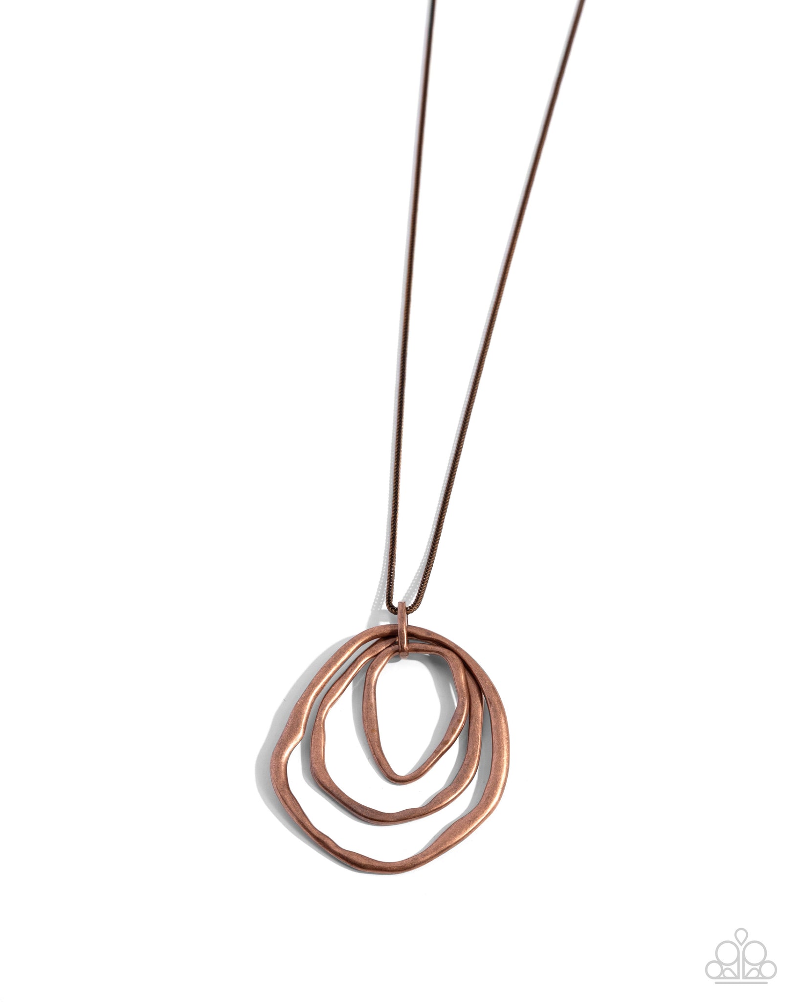 A trio of mismatched warped copper rings swing from the bottom of an antiqued copper chain, creating a rustically stacked pendant. Features an adjustable clasp closure.
