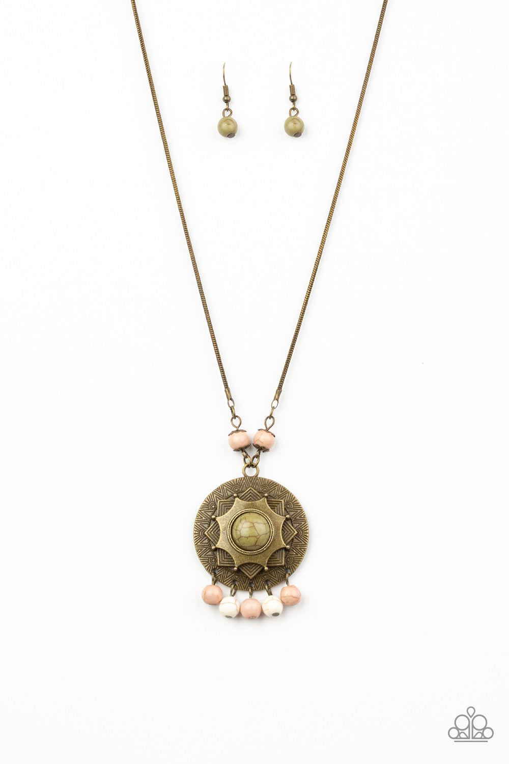 Dotted with an earthy green stone center, a stacked brass pendant gives way to a beaded white and brown stone fringe, creating a colorful tribal inspired pendant below the collar. Features an adjustable clasp closure.