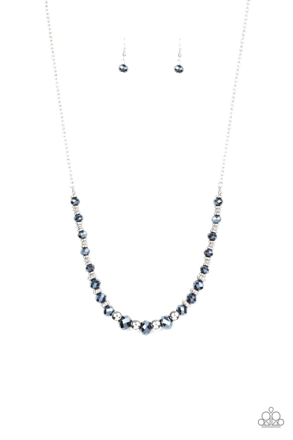 Varying in size, shiny silver beads, textured silver accents, and sparkling blue metallic crystal-like beads are threaded along an invisible wire at the bottom of a lengthened silver chain for a refined flair. Features an adjustable clasp closure.