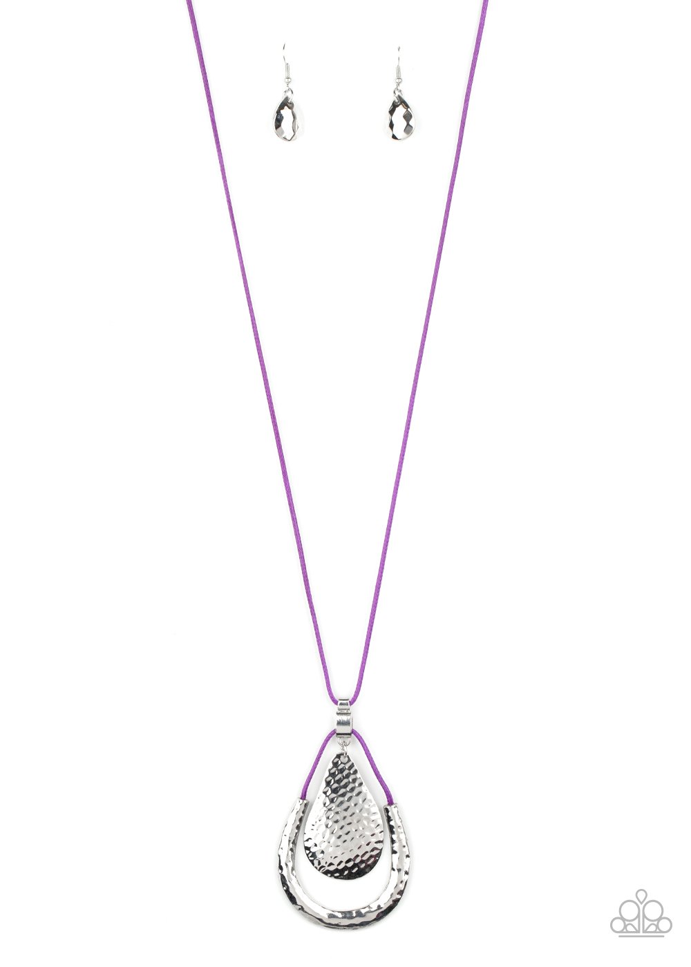 Attached to a shiny silver fitting, a hammered silver teardrop swings from the top of a shiny purple cord pendant featuring a hammered silver accent. The stacked pendants swing from the bottom of a lengthened piece of purple cord for a colorfully trendy look. Features an adjustable clasp closure.