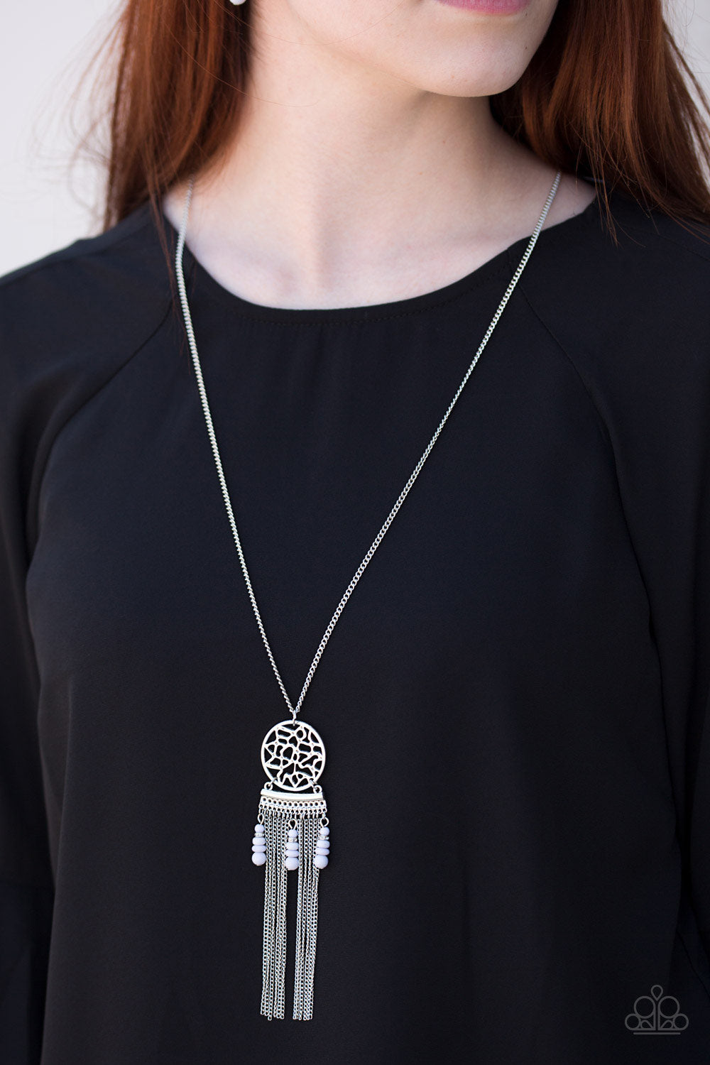 Featuring a dream-catcher pattern, a shimmery silver frame swings from the bottom of an elongated silver chain. Stacked gray beads and shimmery silver chains stream from the bottom of the pendant, creating a whimsical fringe. Features an adjustable clasp closure.