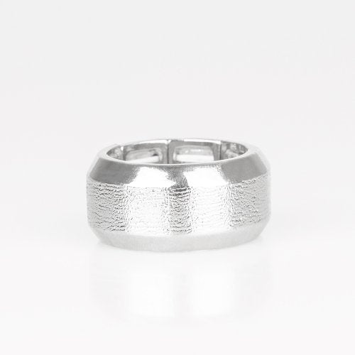 The center of a beveled silver band has been delicately hammered in shimmery detail for a metro inspired look. Features a stretchy band for a flexible fit.