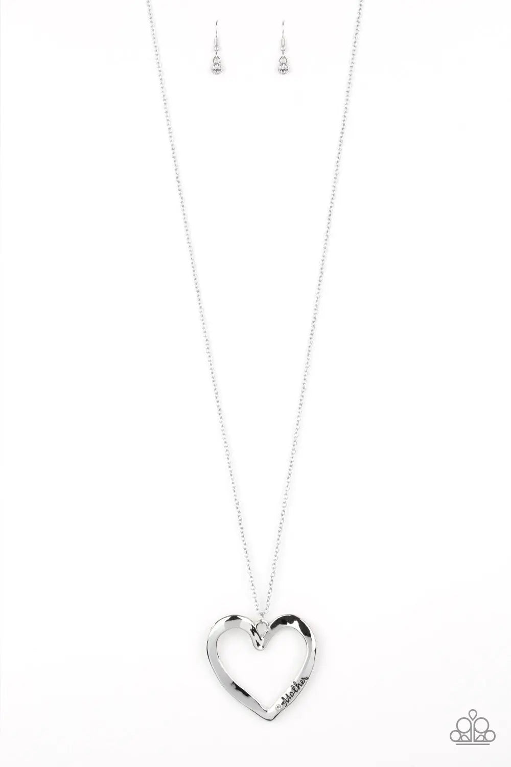 Swinging from the bottom of a lengthened silver chain, an asymmetrical heart pendant is stamped in the word, "mom" and dotted with a single white rhinestone for a whimsical look. Features an adjustable clasp closure.