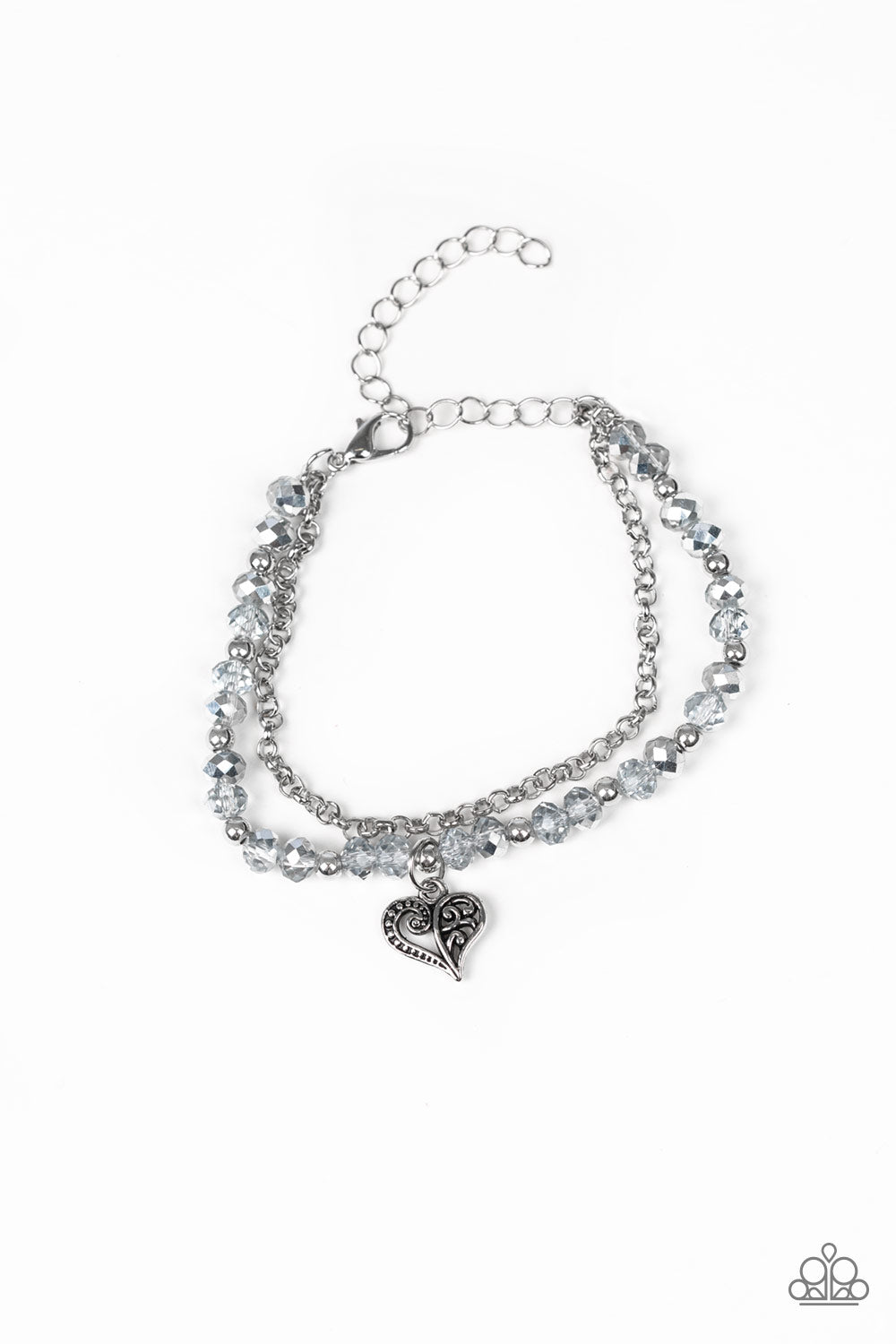 Dainty silver beads join a collection of glassy and metallic crystal-like beads around the wrist. Infused with a dainty silver chain, an ornate silver heart charm swings from the beaded strand for a romantic finish. Features an adjustable clasp closure.